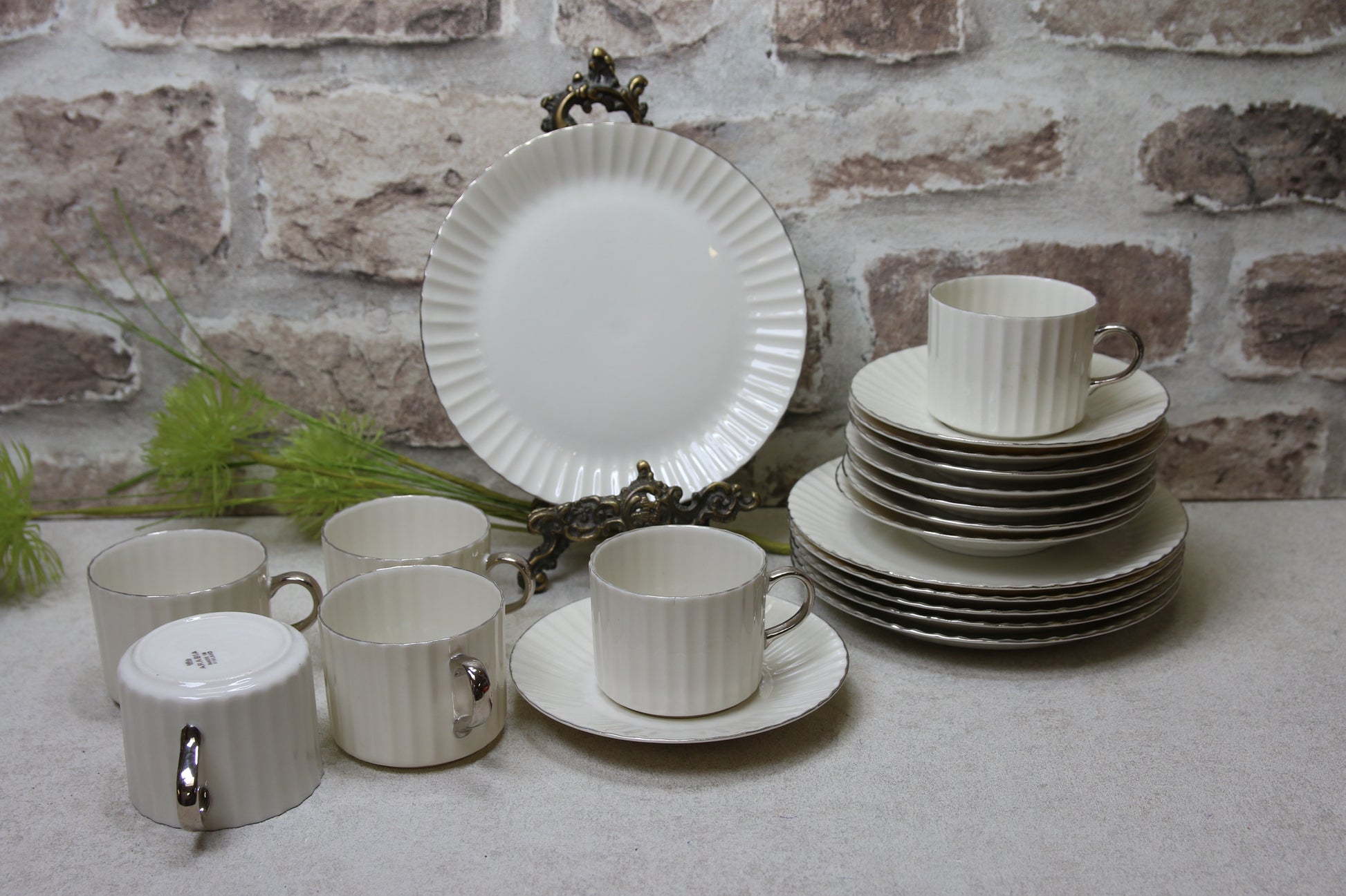 Setti sisältää 5kahvikuppia, 7 aluslautasta, 6 leivoslautasta.