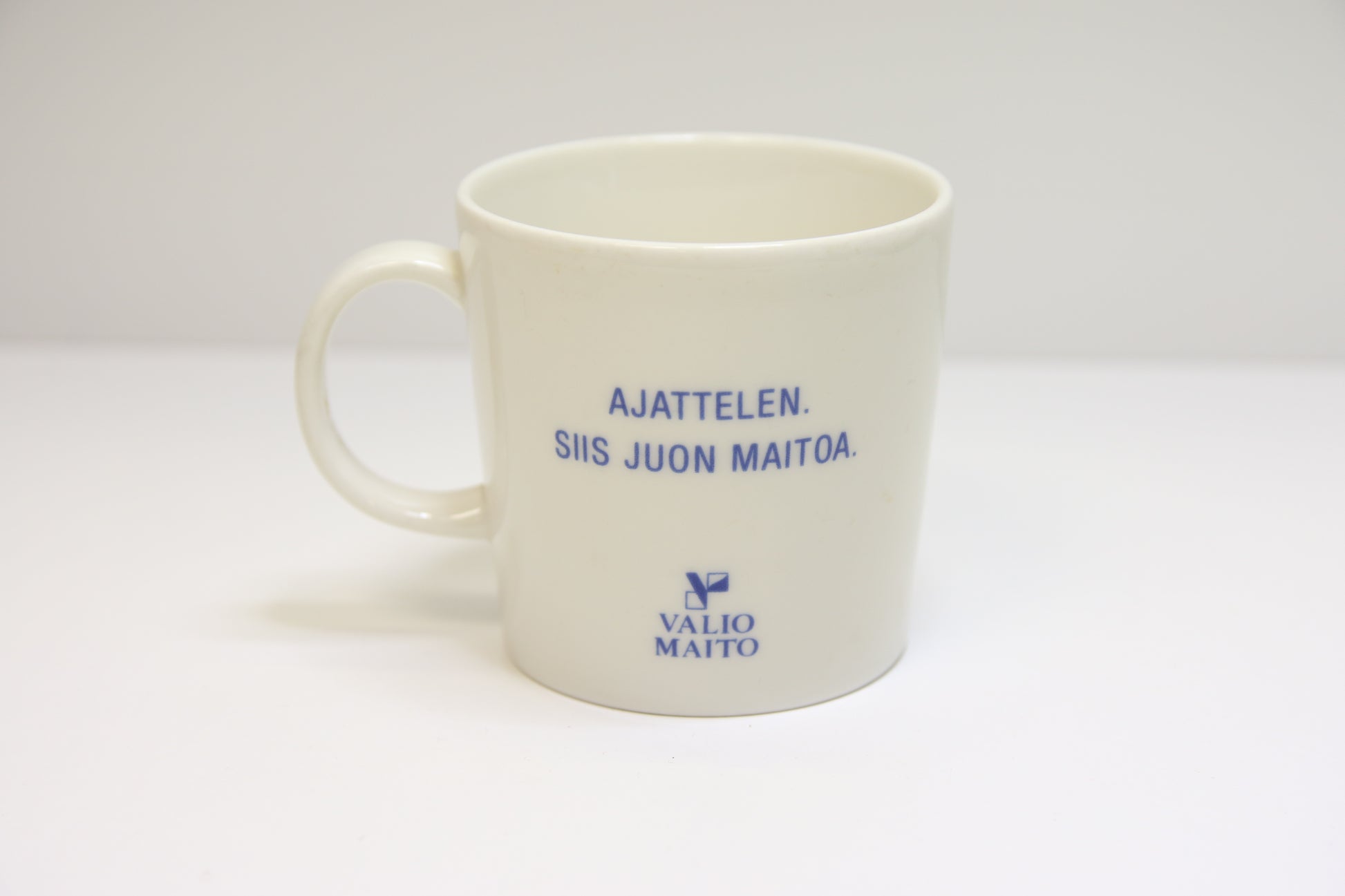Mukissa teksti Ajattelen siis juon maitoa Valio maito.