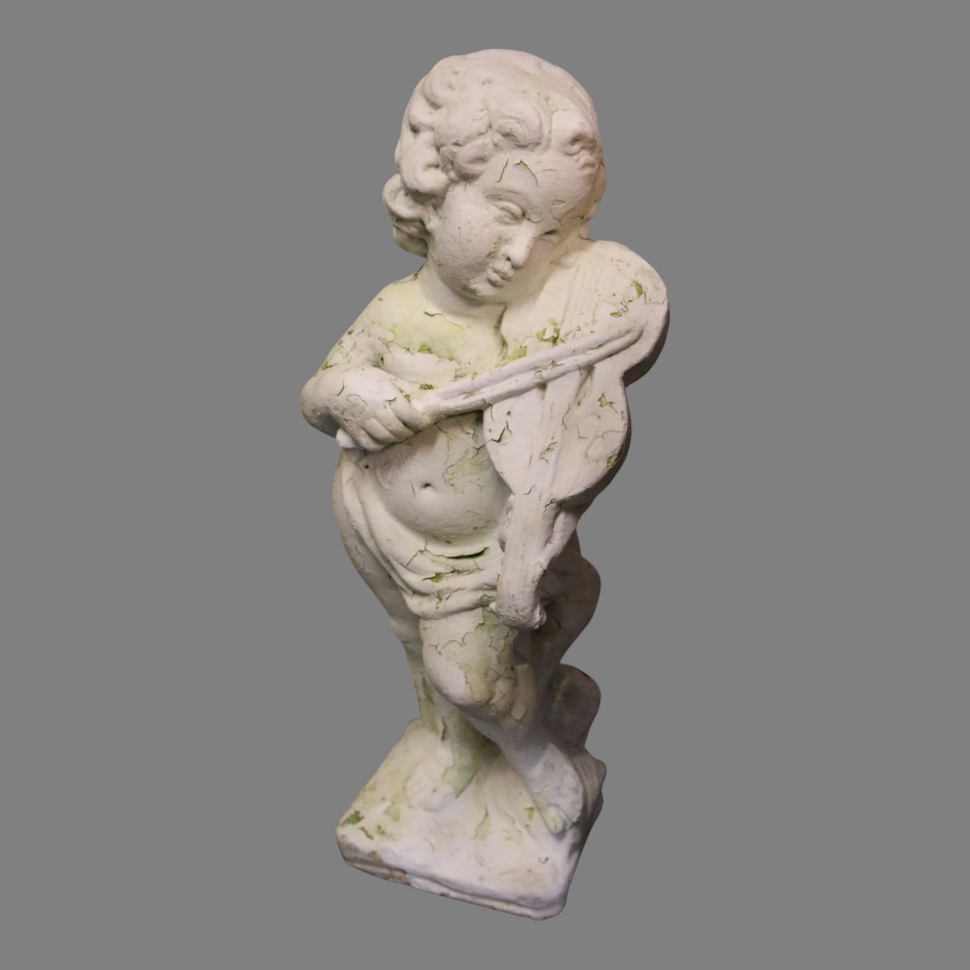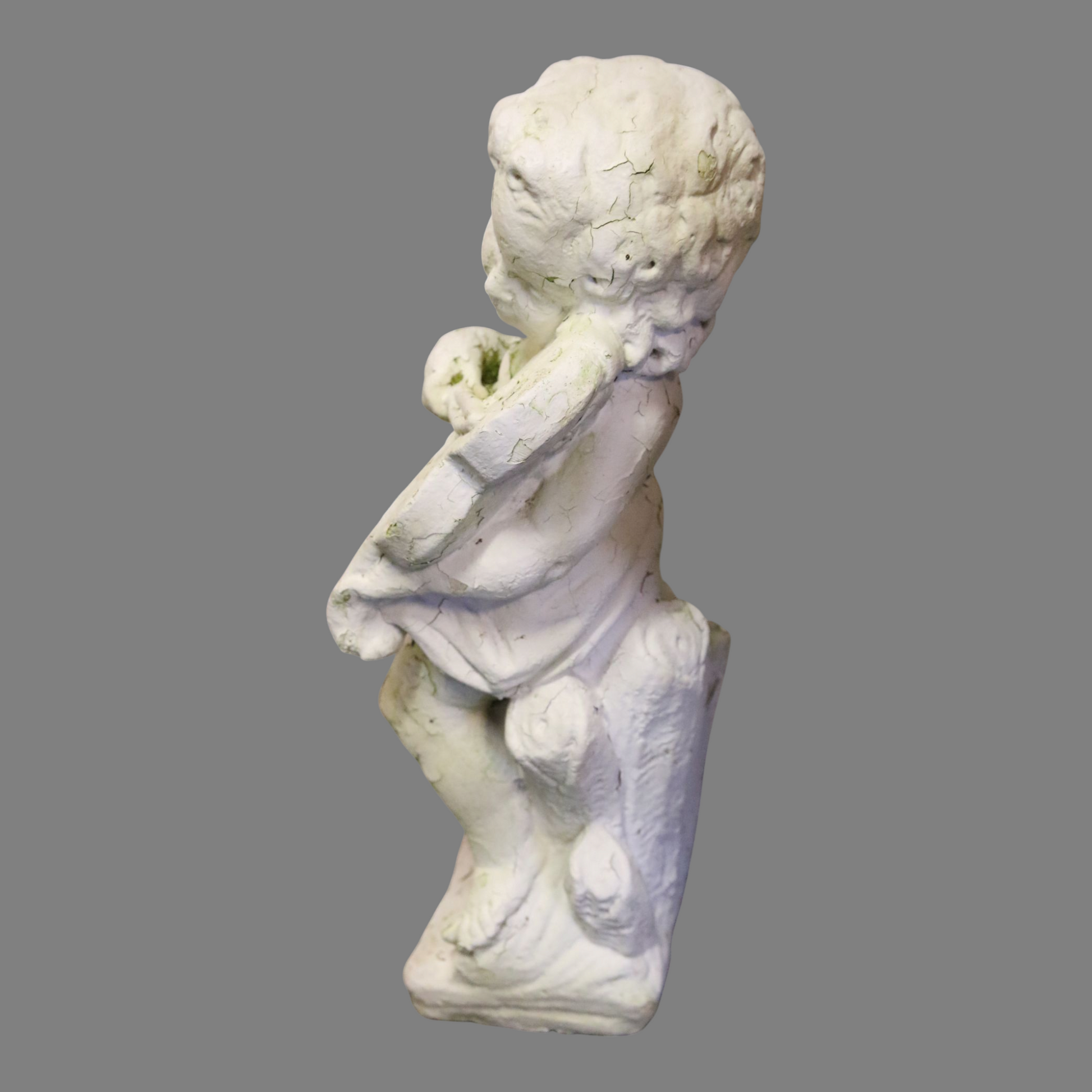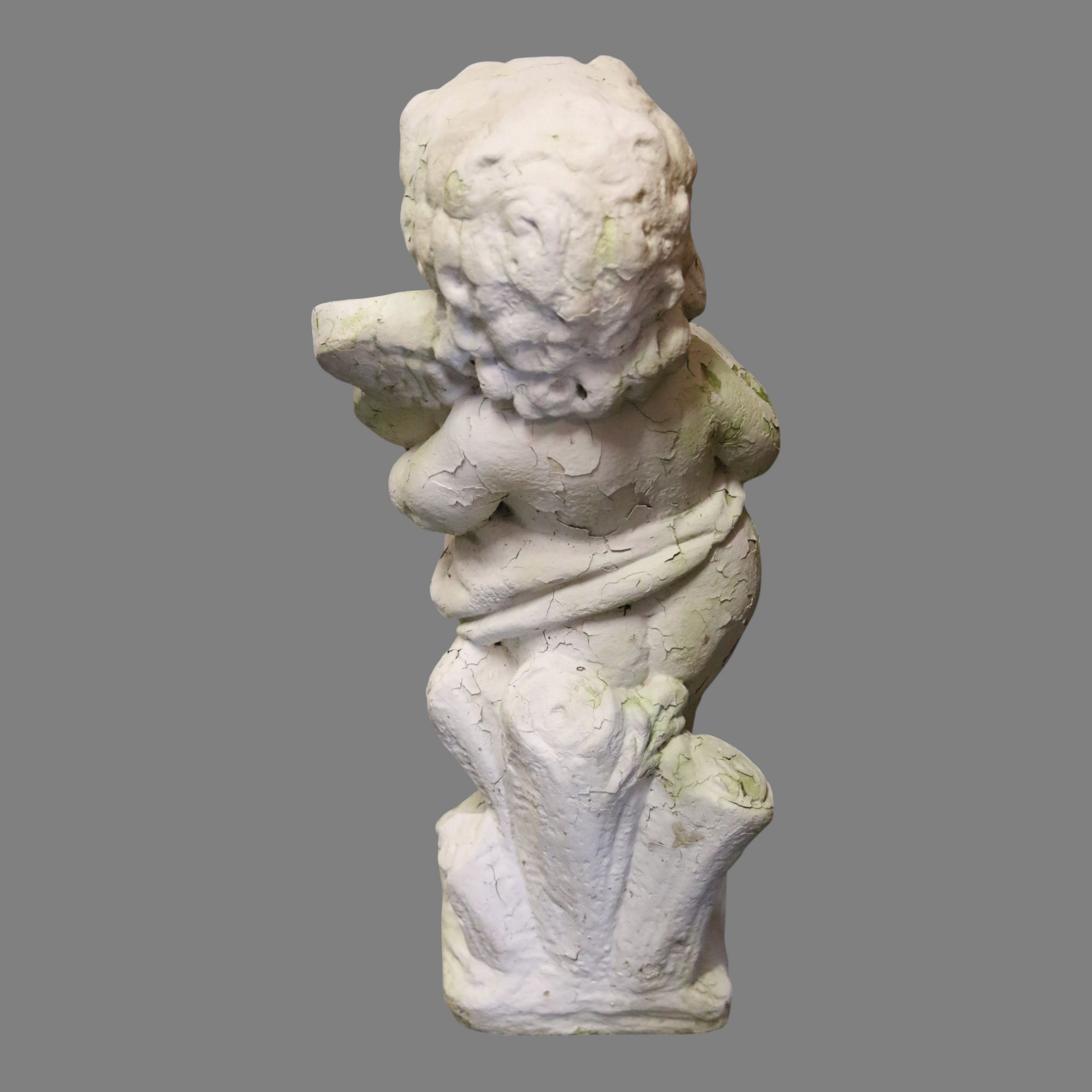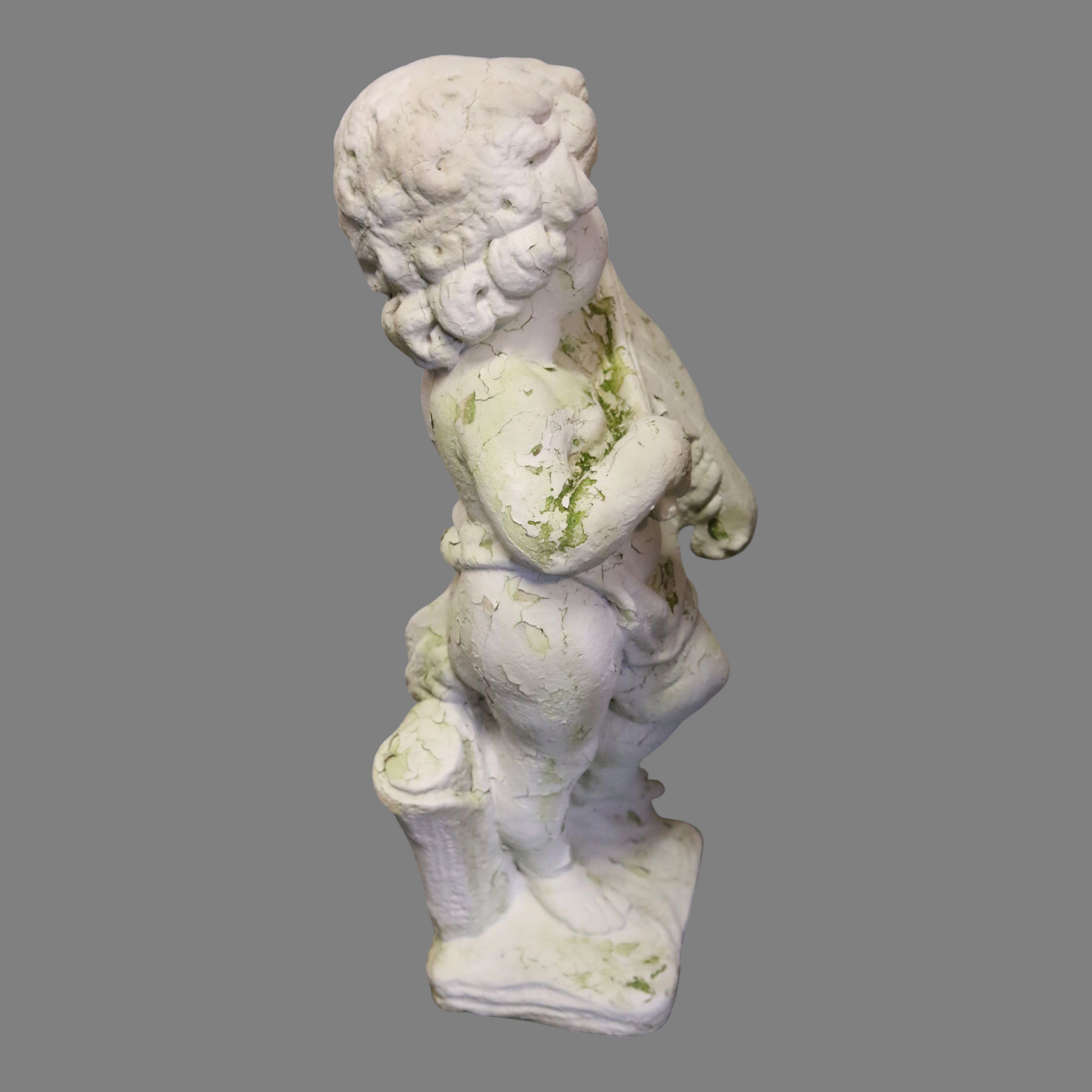 Vanha betonista valmistettu enkelipatsas. Soveltuu ulkokäyttöön. Painava.