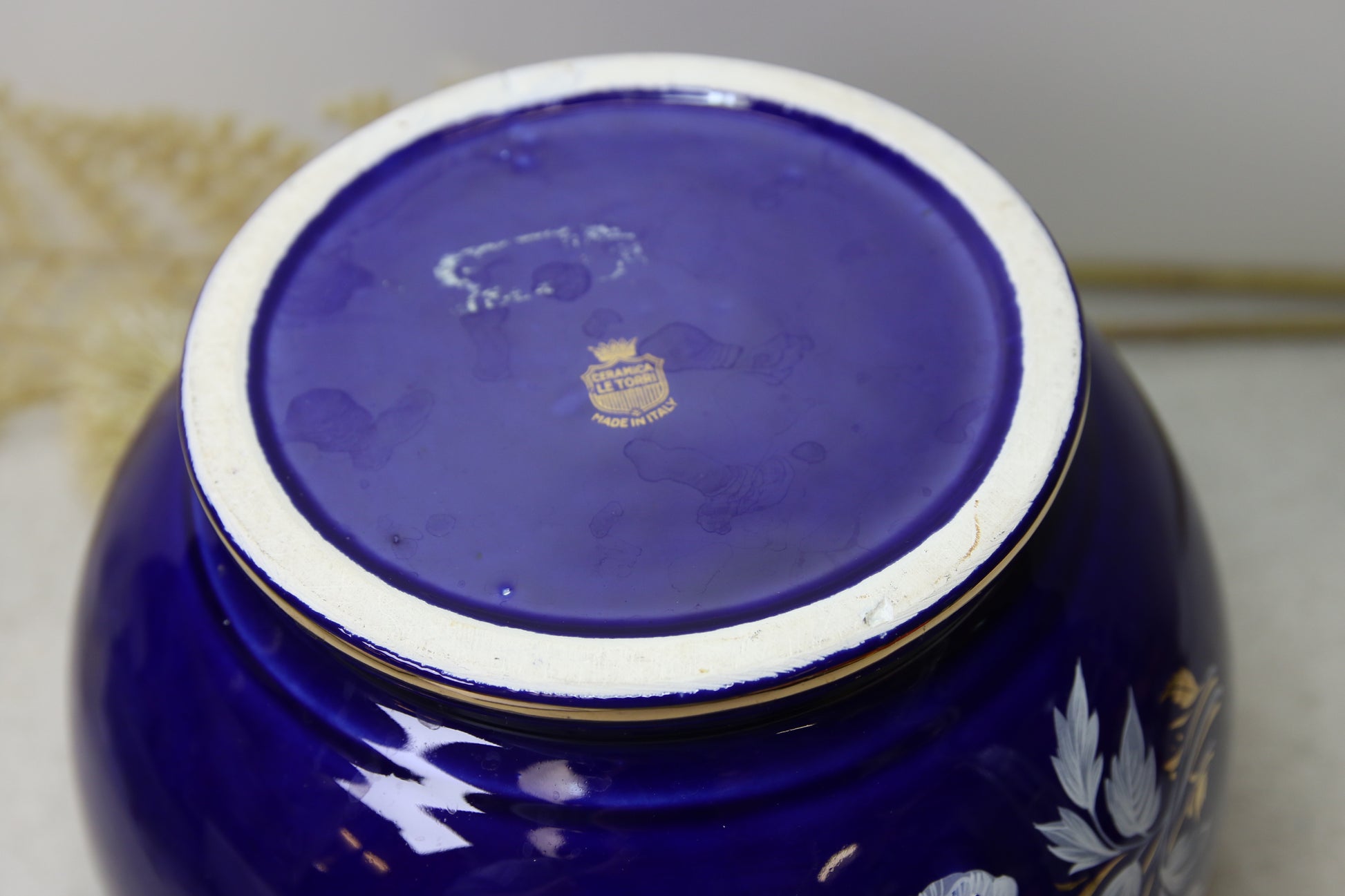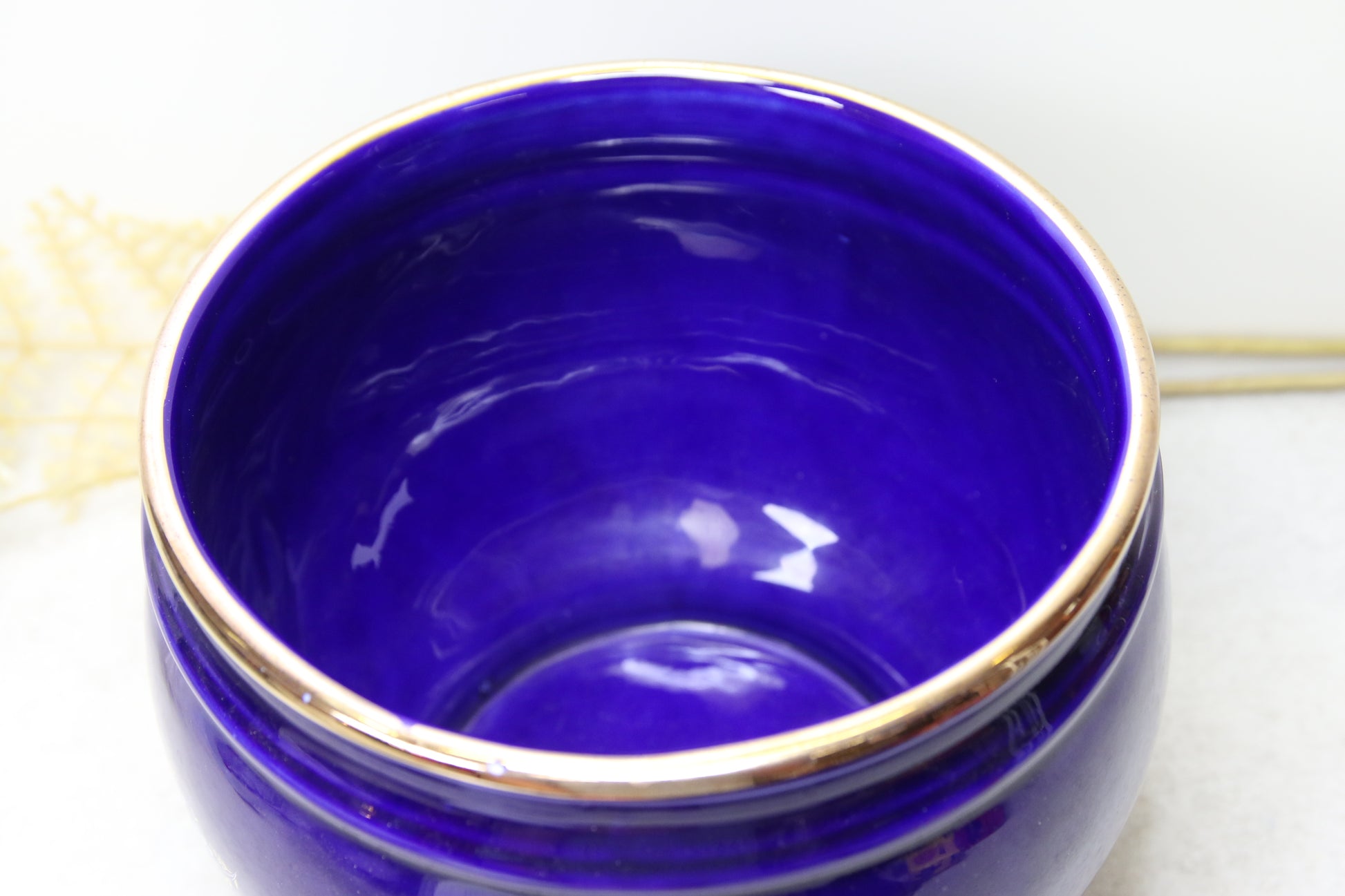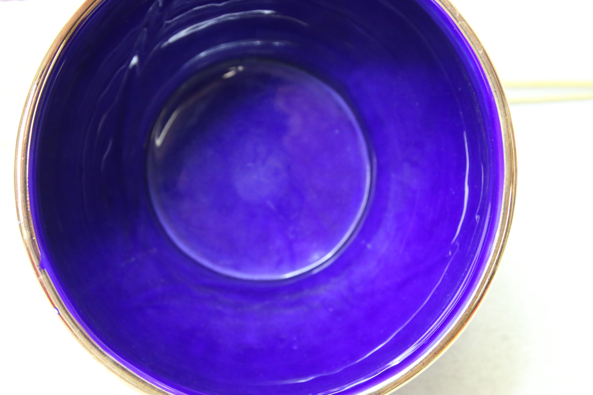Koboltinsininen, kultareunus ja kukkakuviot ympäriinsä.