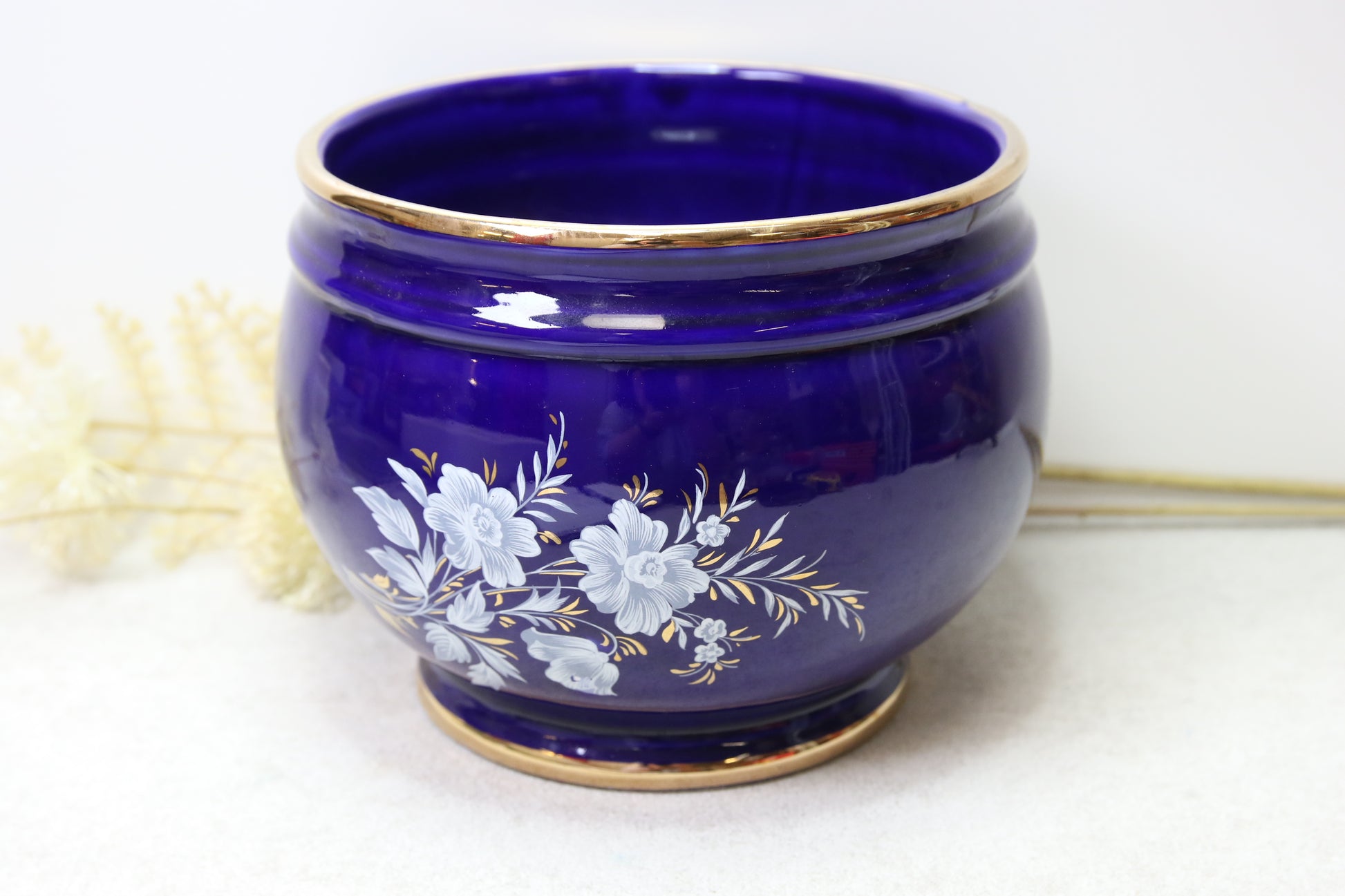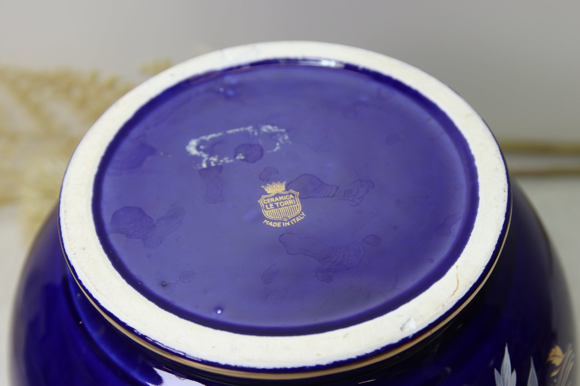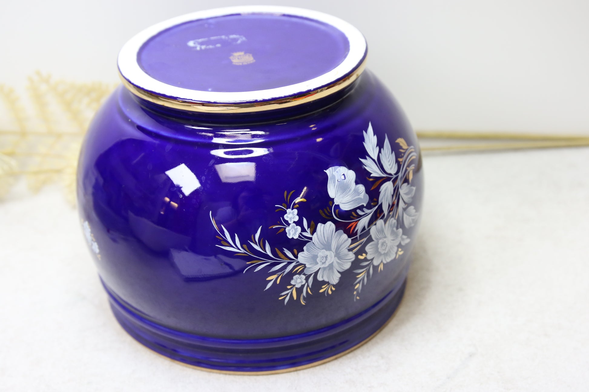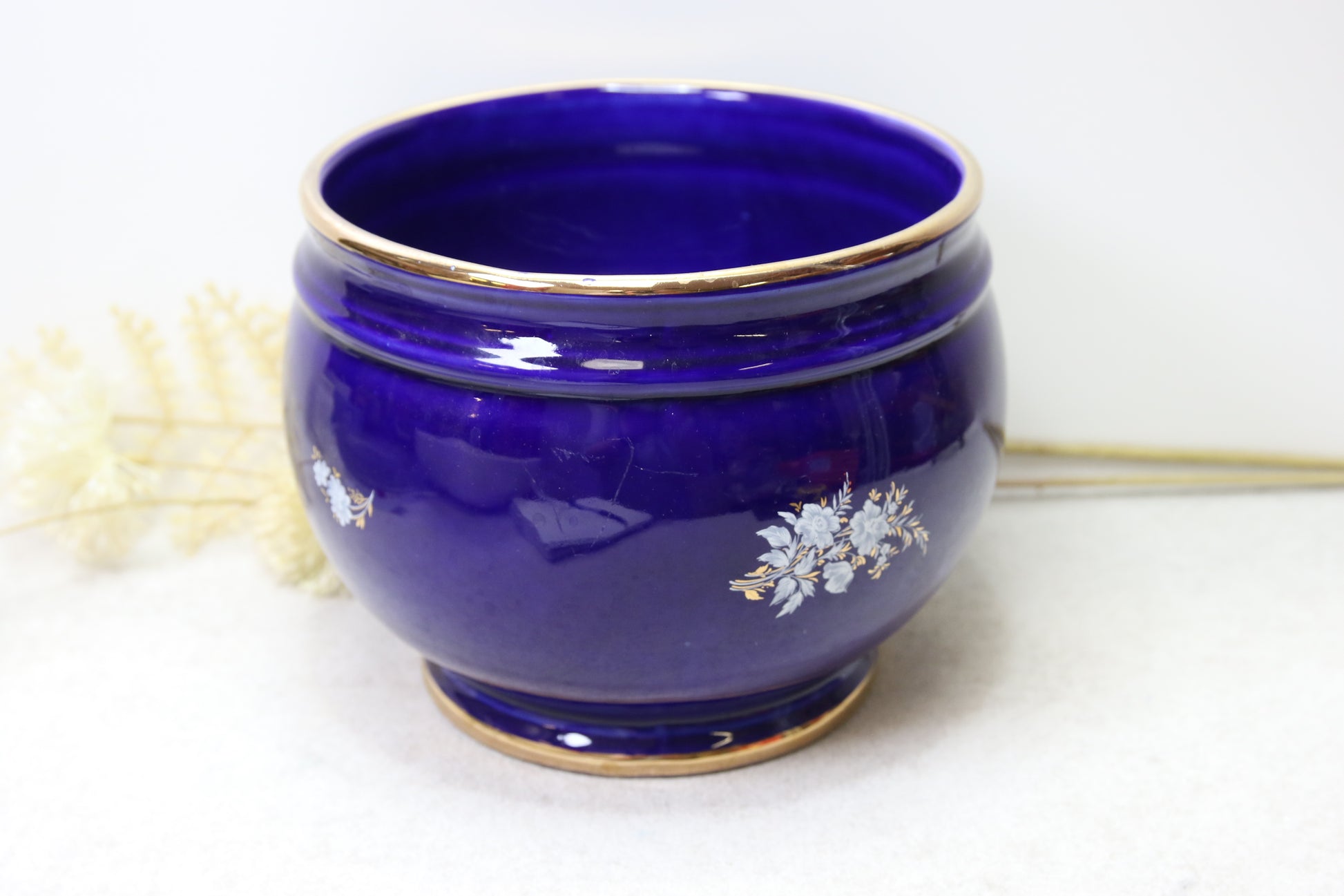 Koboltinsininen, kultareunus ja kukkakuviot ympäriinsä.
