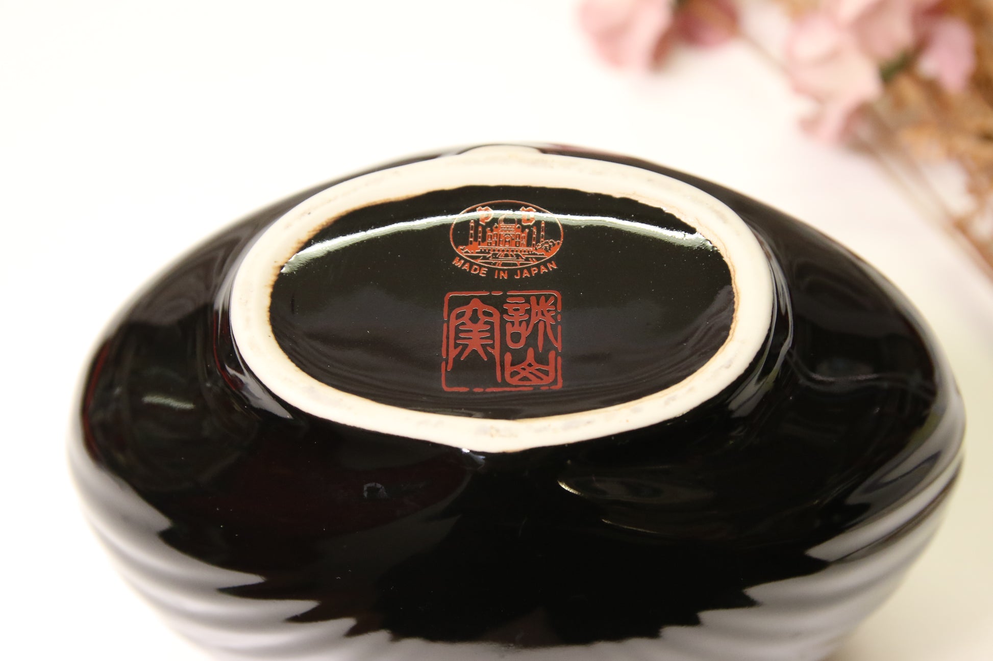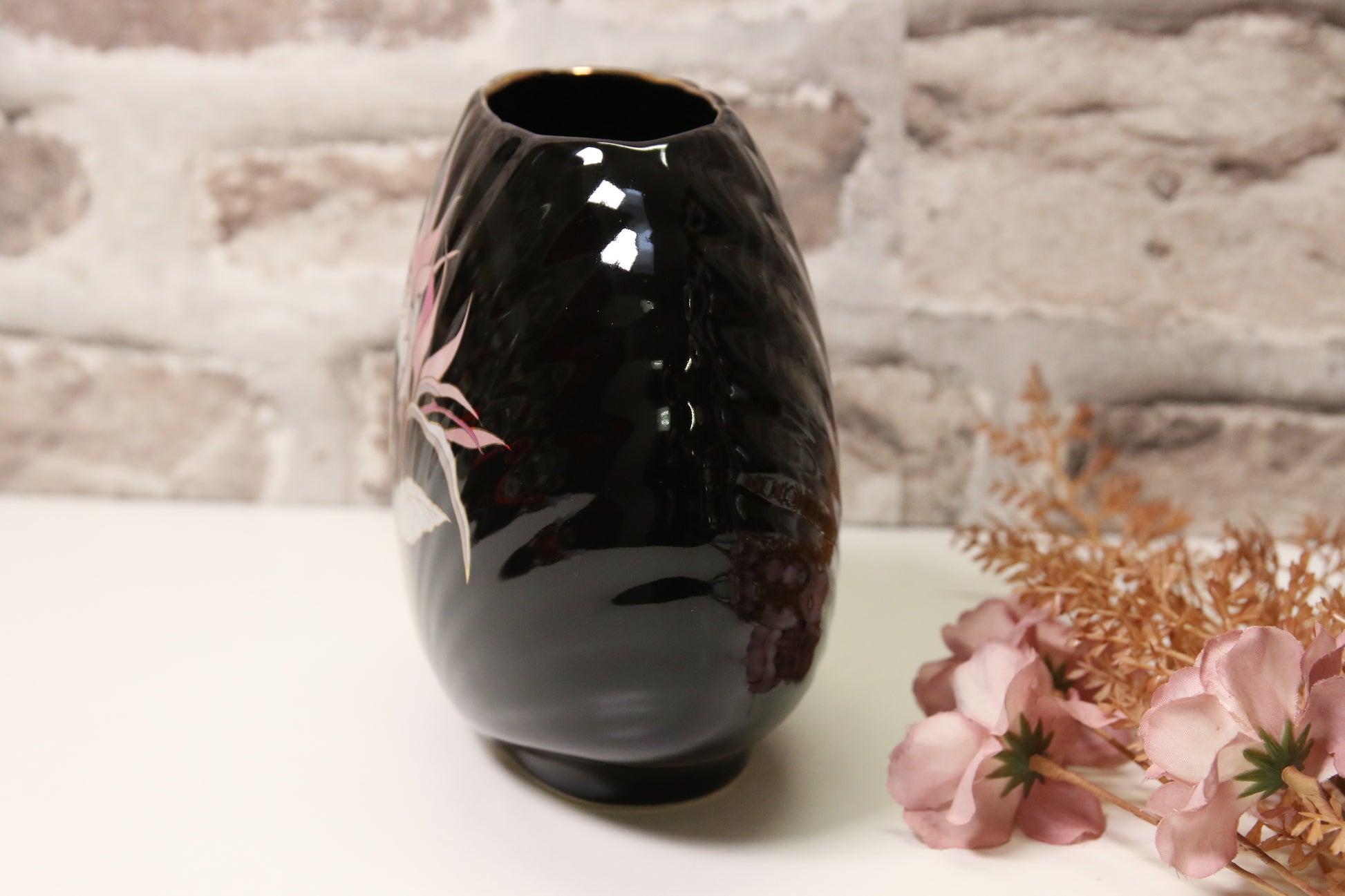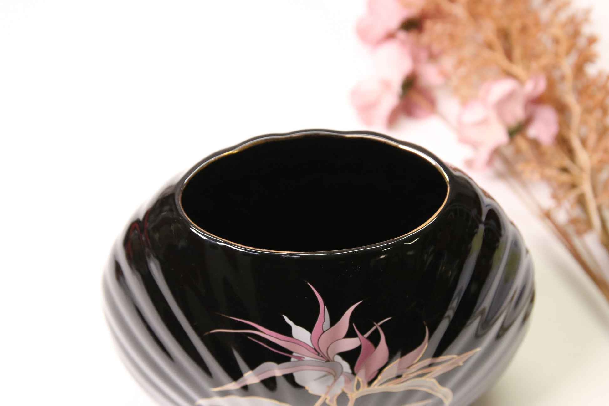 Musta japanissa valmistettu maljakko kukka-aiheisella kuvalla.