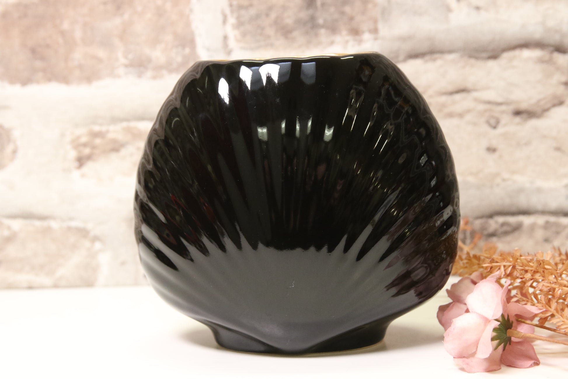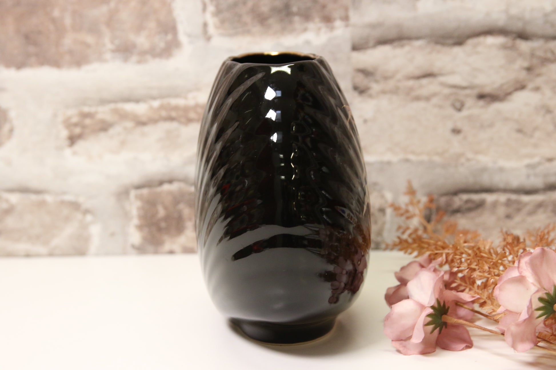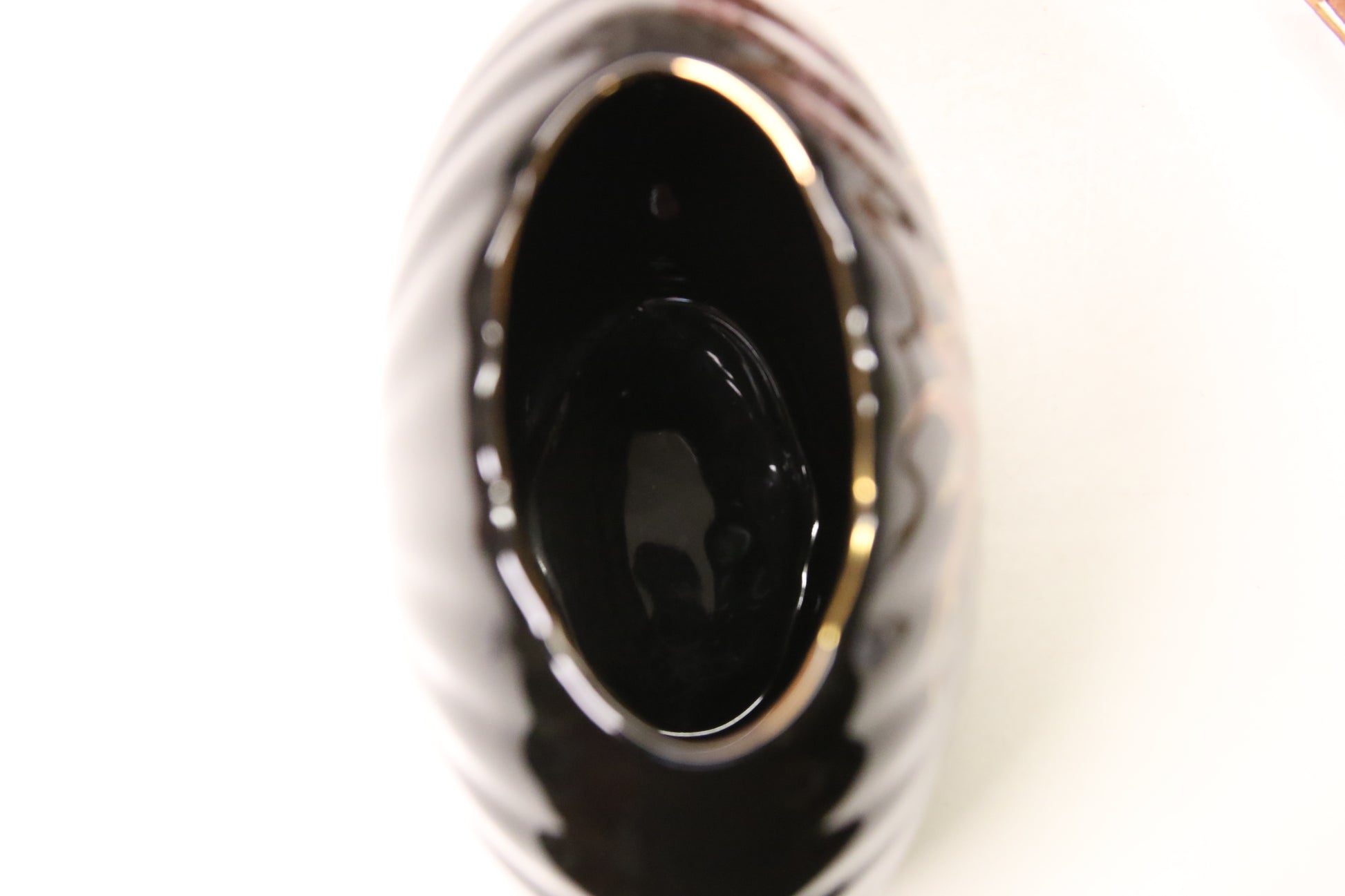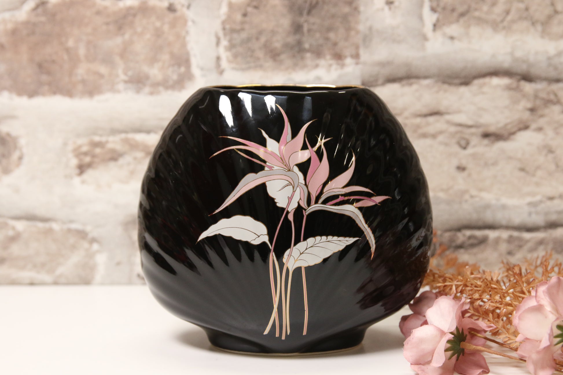Musta japanissa valmistettu maljakko kukka-aiheisella kuvalla.