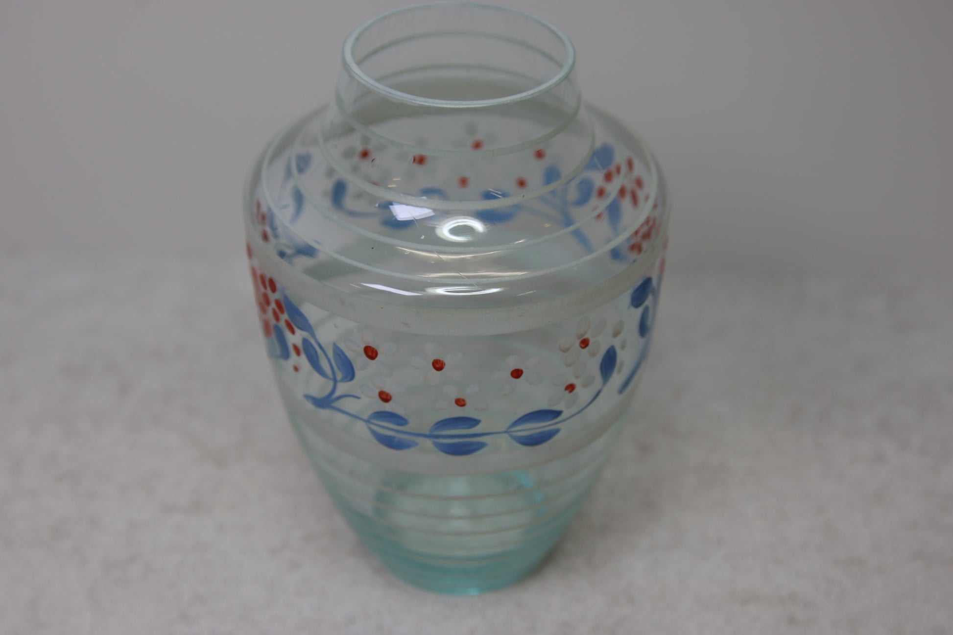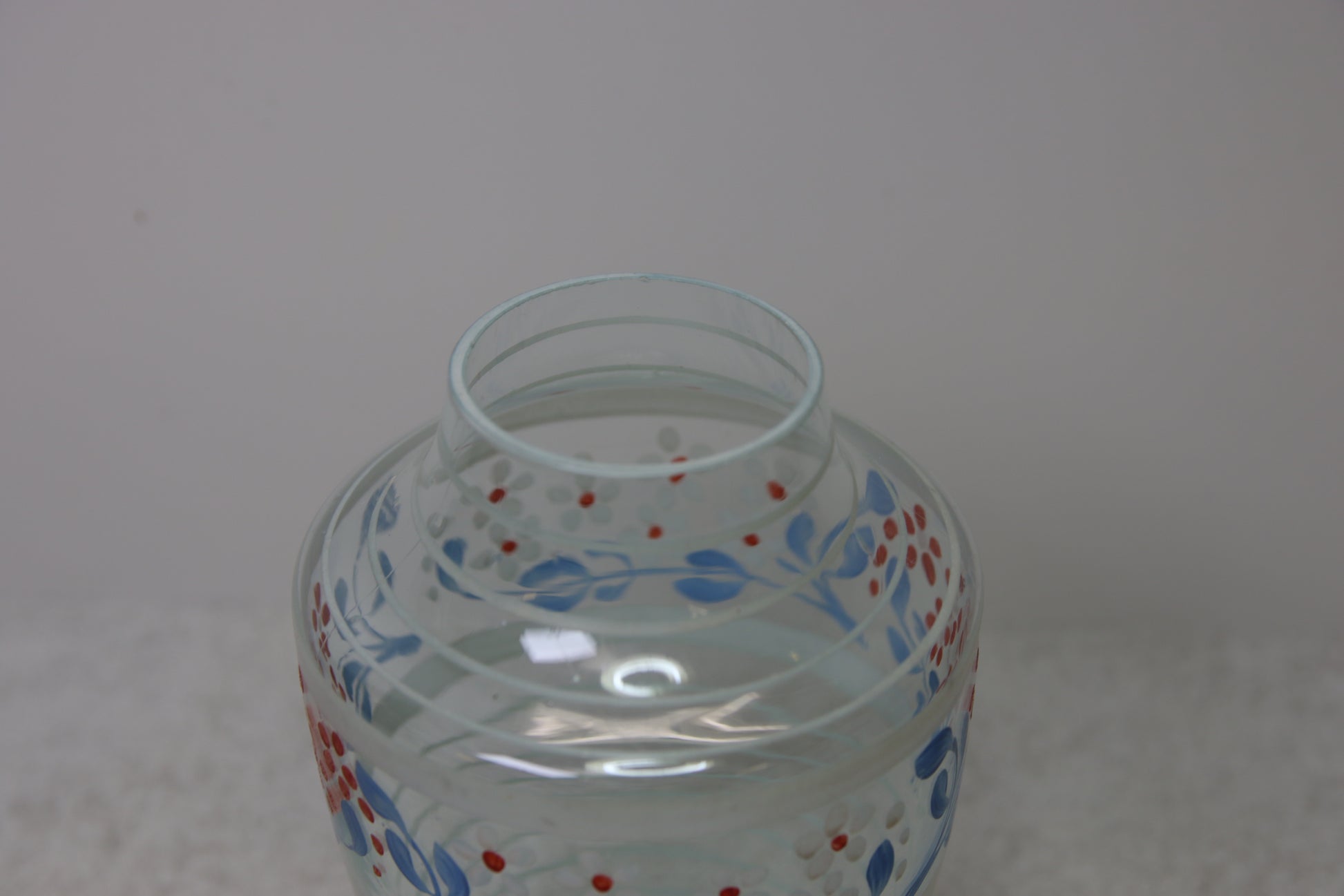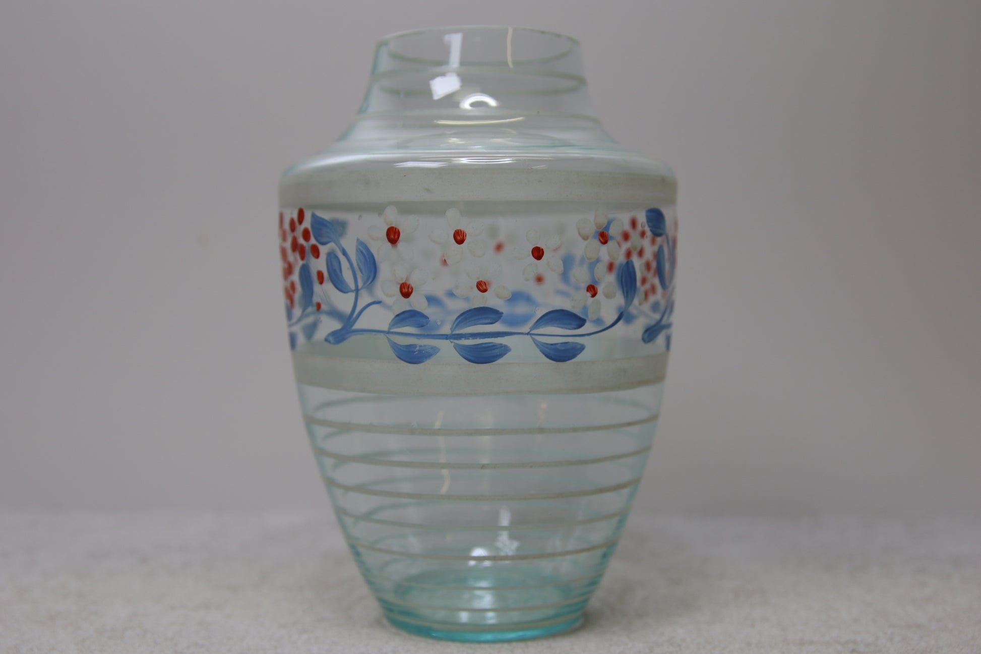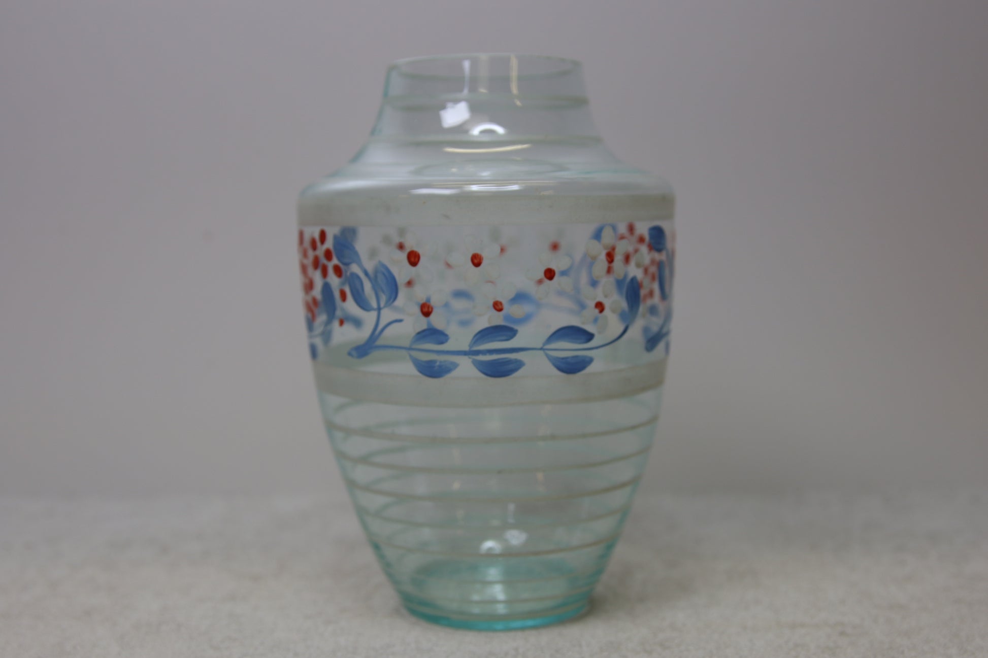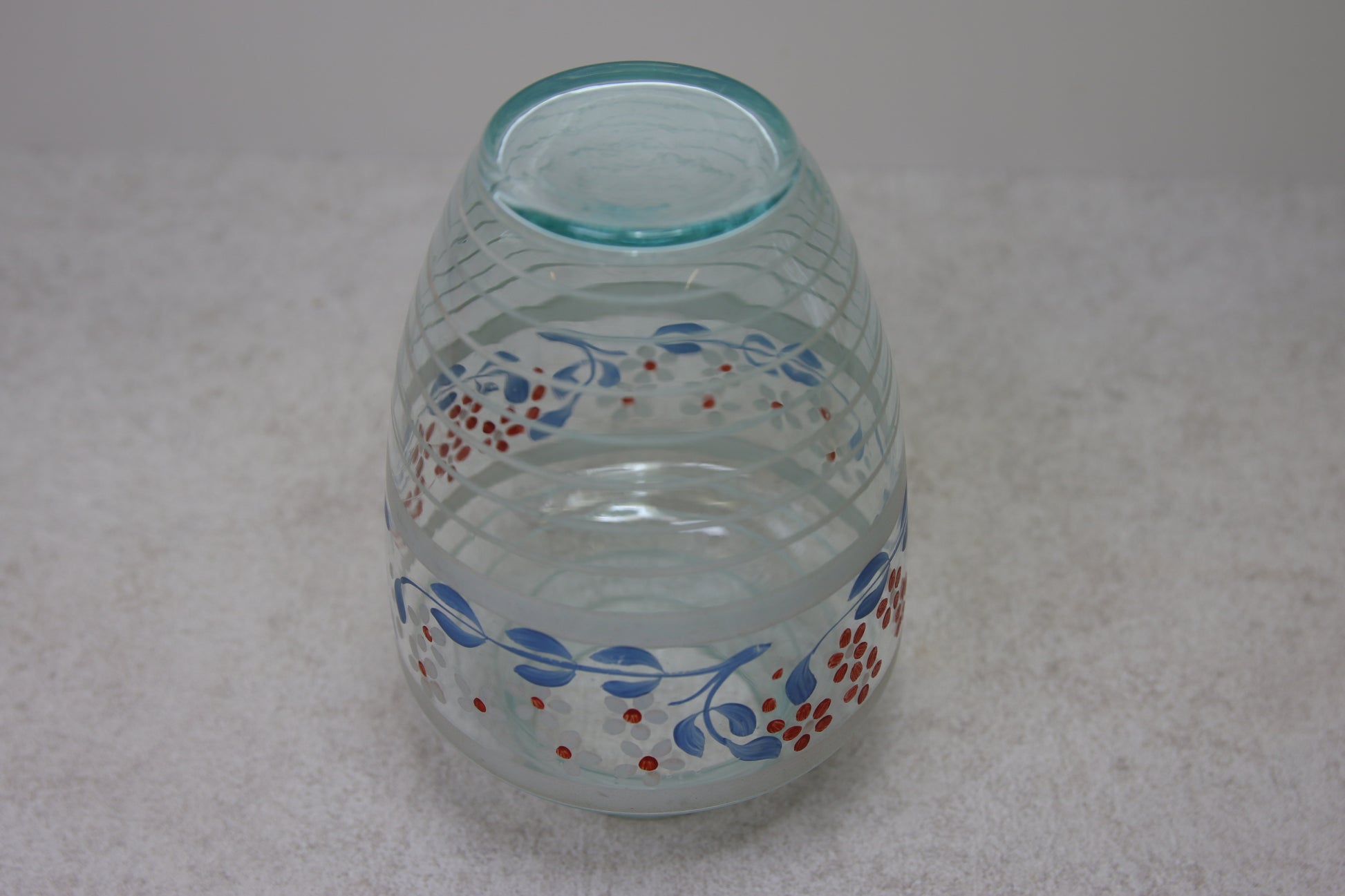 Käsin maalattu muottiin puhallettu lasi. Pieni reunarikko.