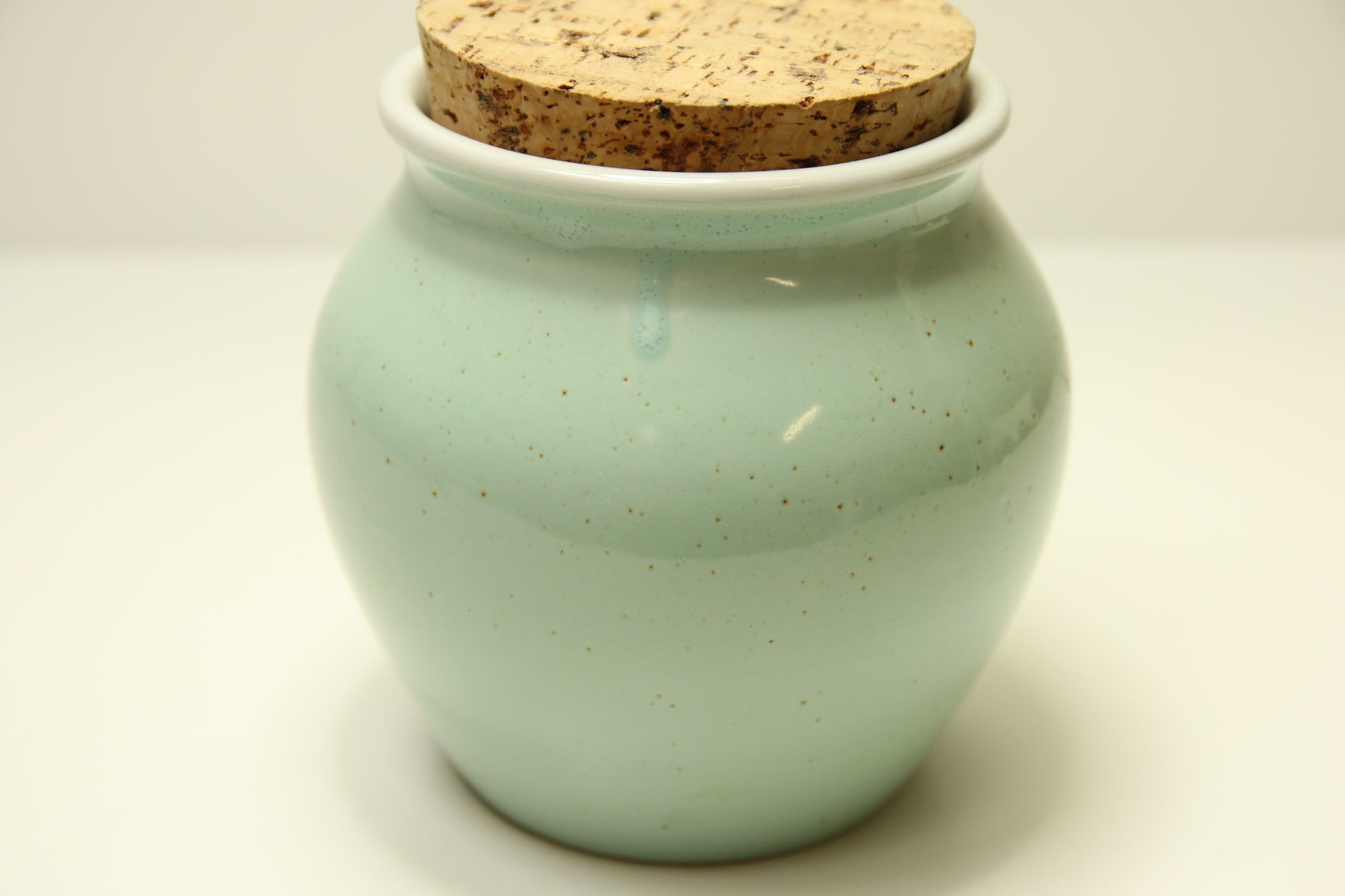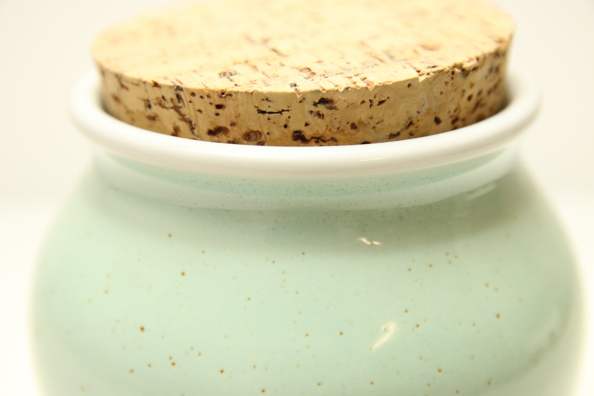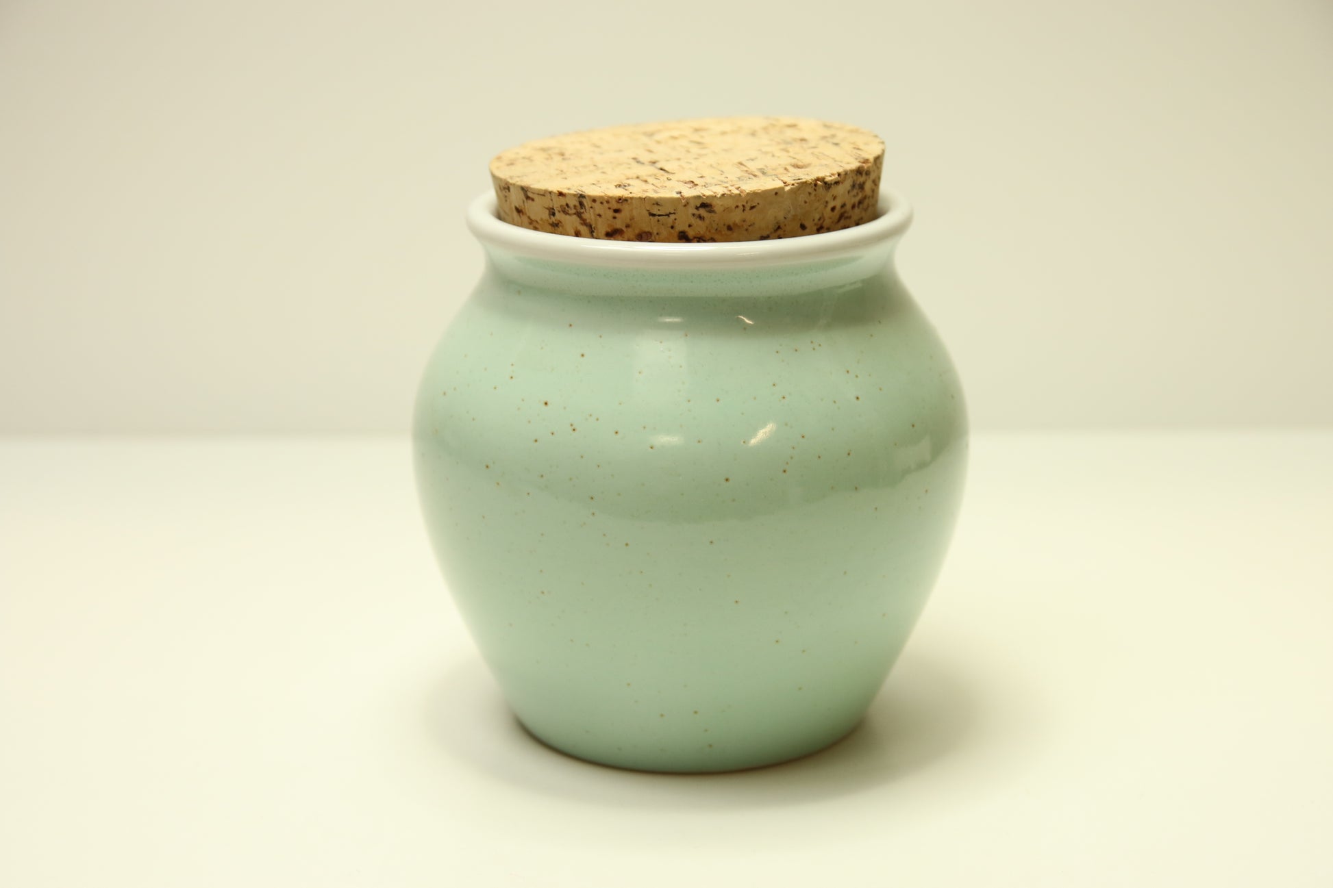 Pentikin mintun sävyinen säilytyspurkki korkilla.