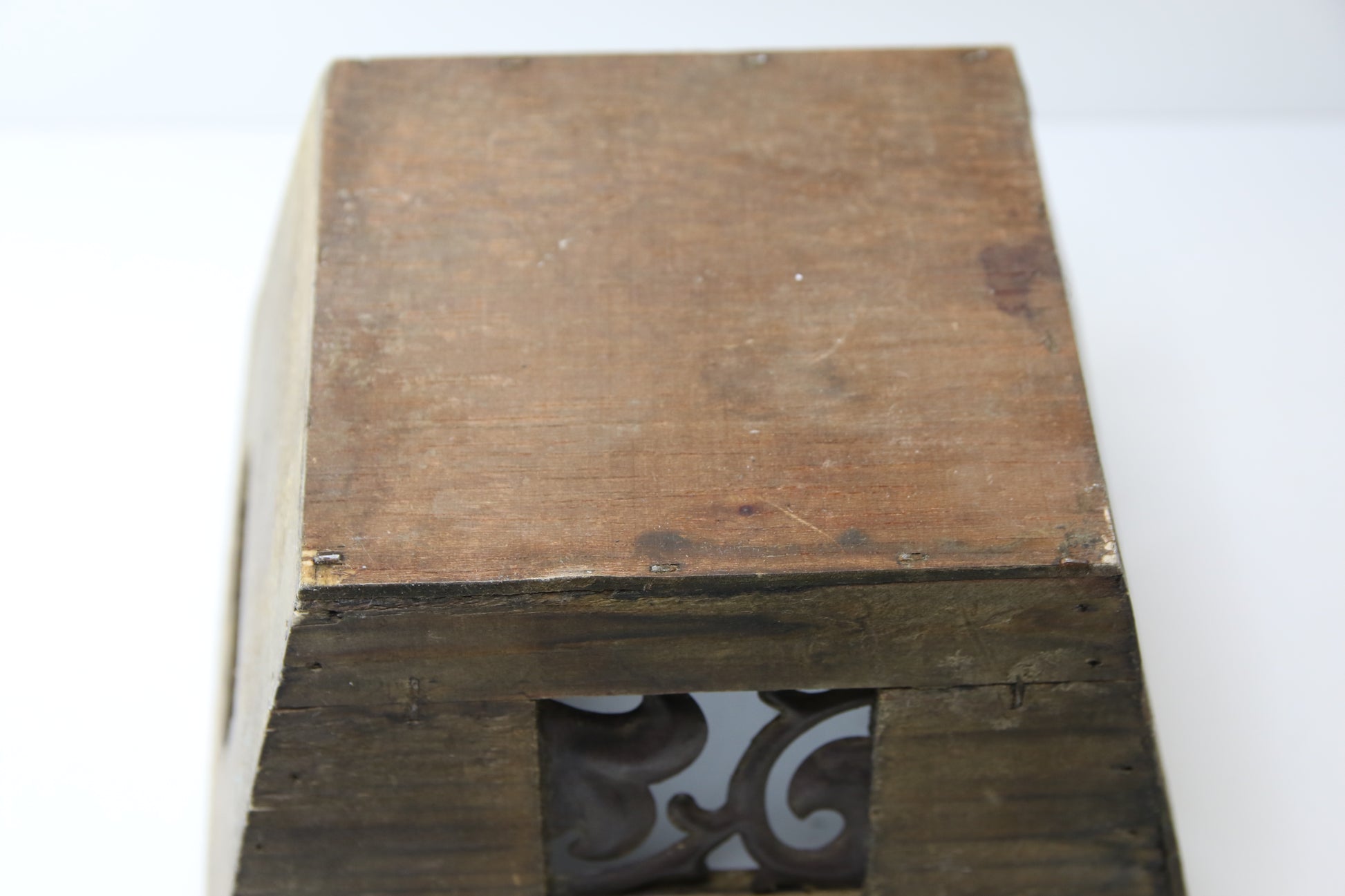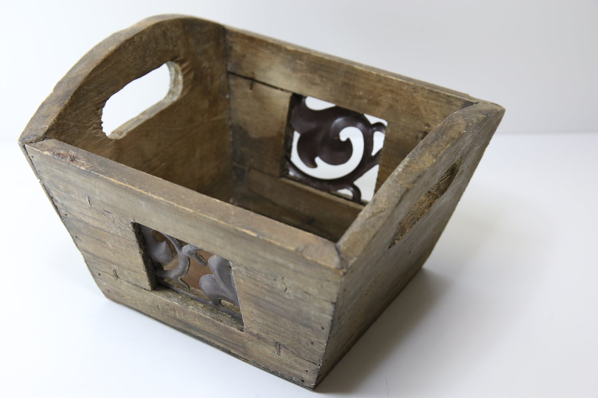 Vanha puinen rasia/ruukku, koristeet metallia.