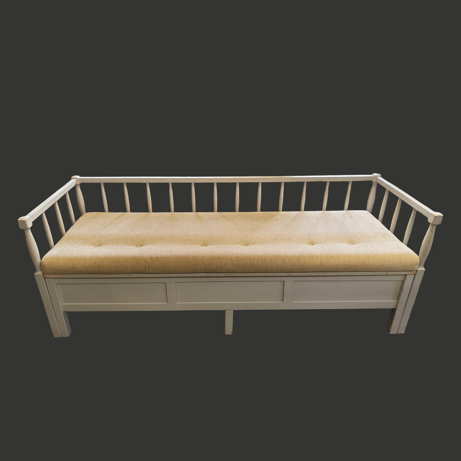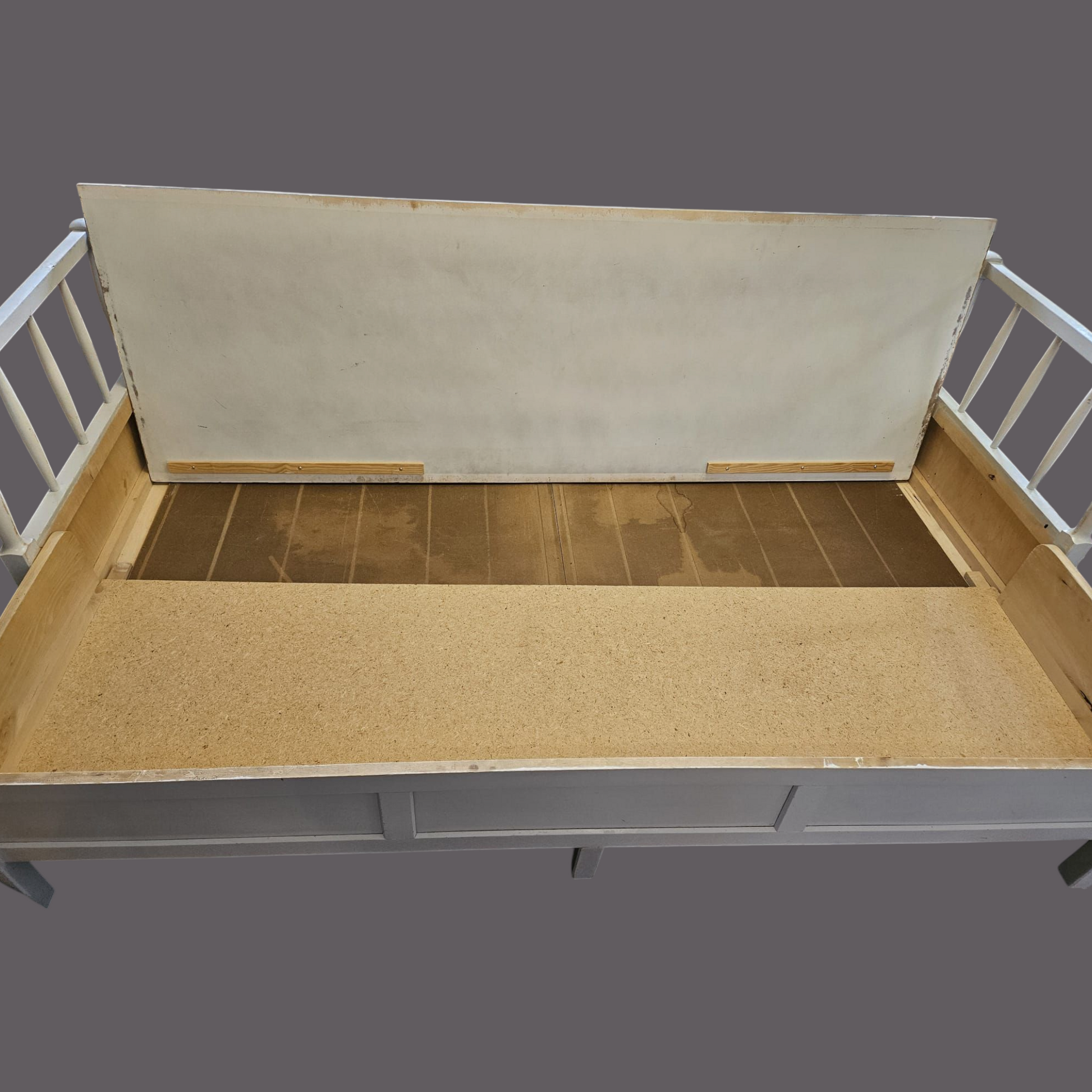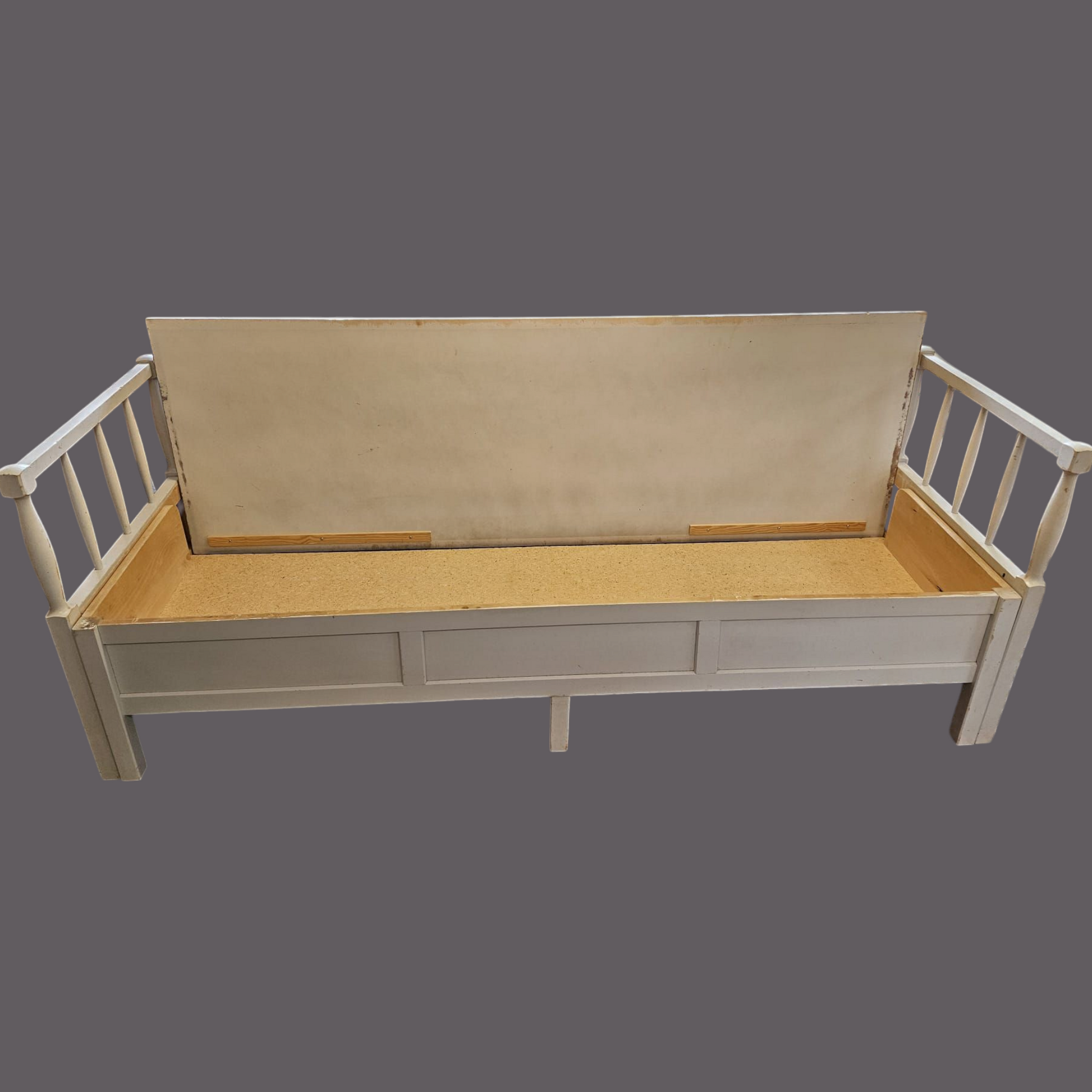 Vanha puusohva, joka menee osiin. Osat kevyet kantaa. Mukana pehmuste.