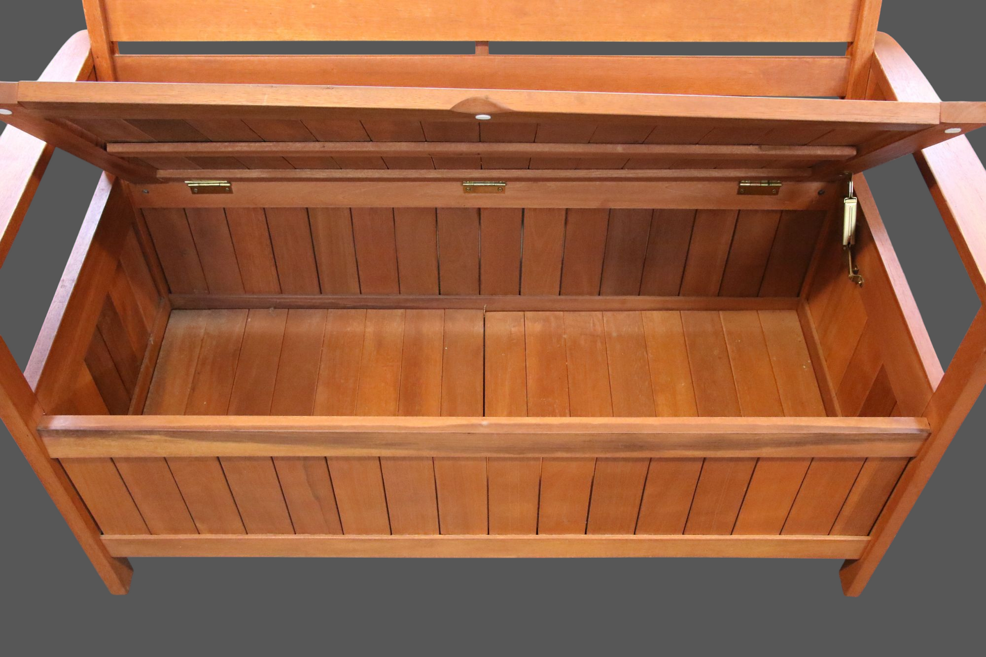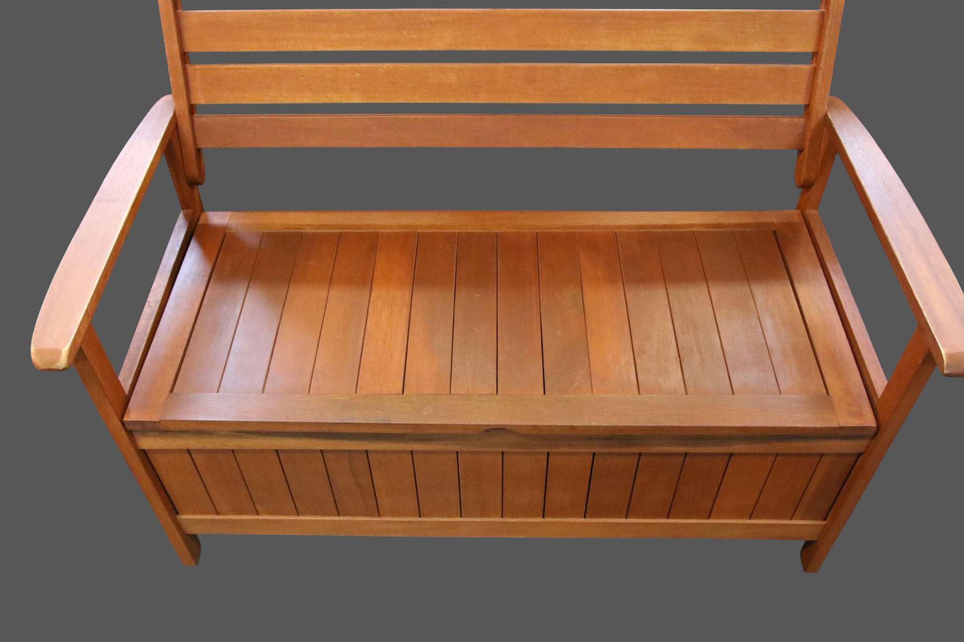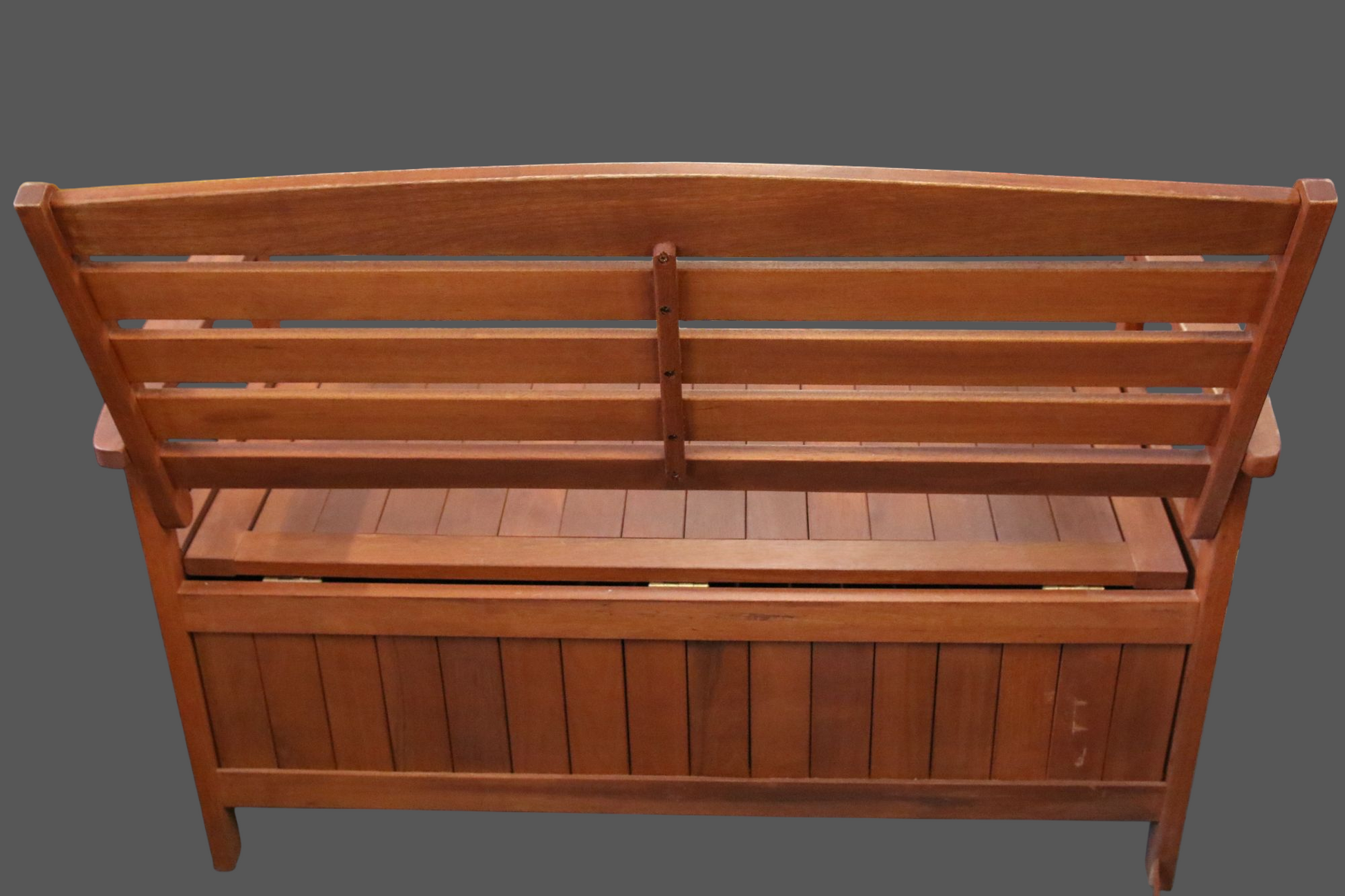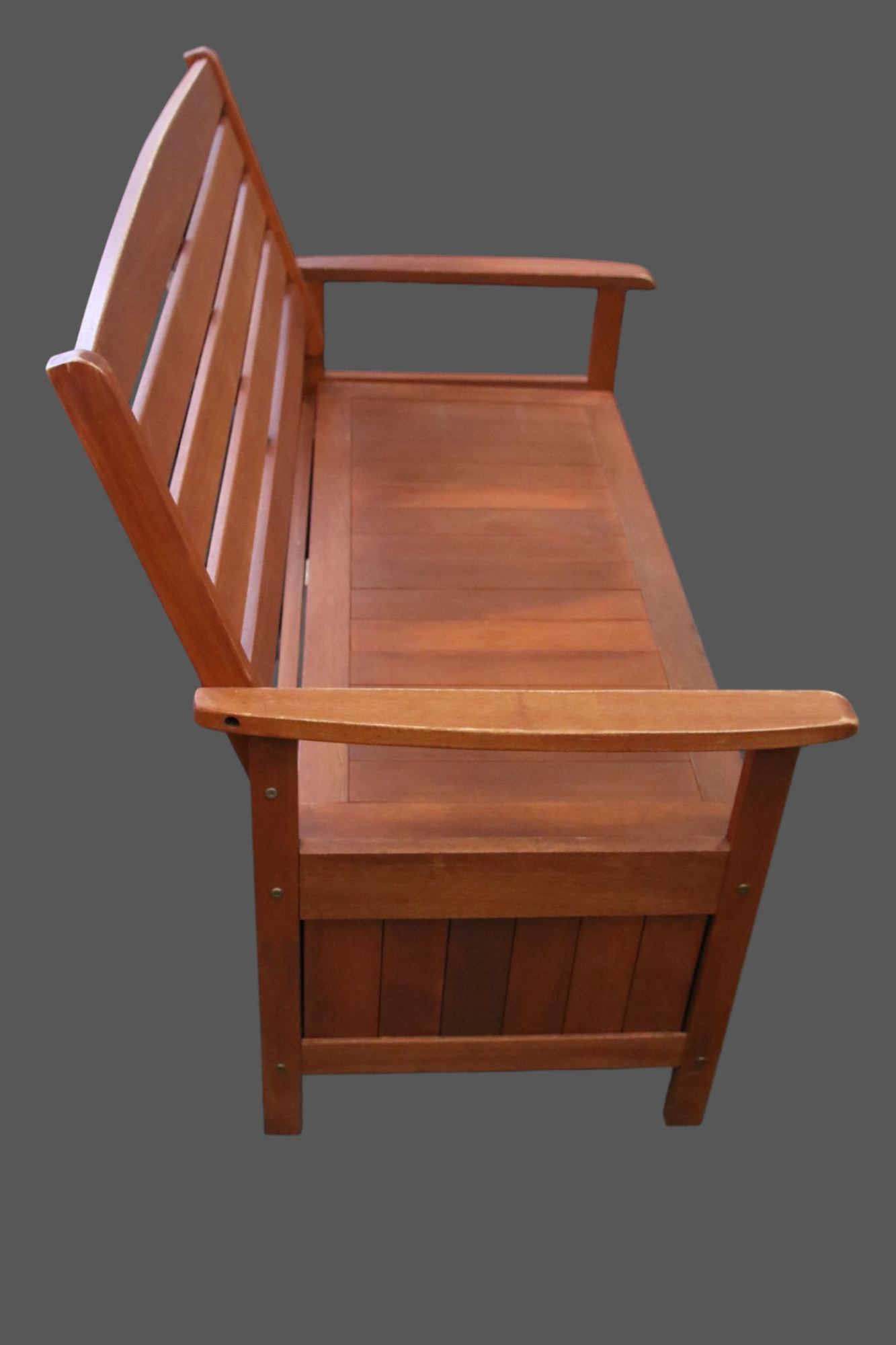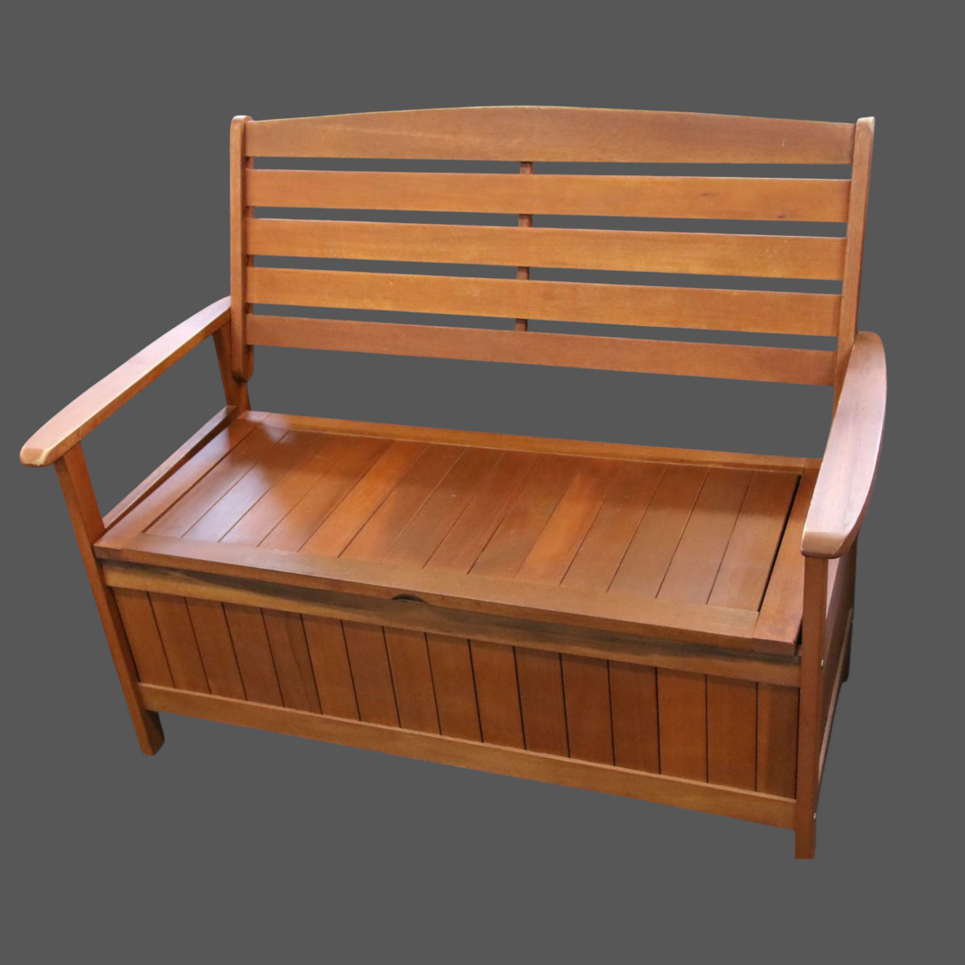 Punertavan ruskea puutarhasohva/penkki säilytystilalla.