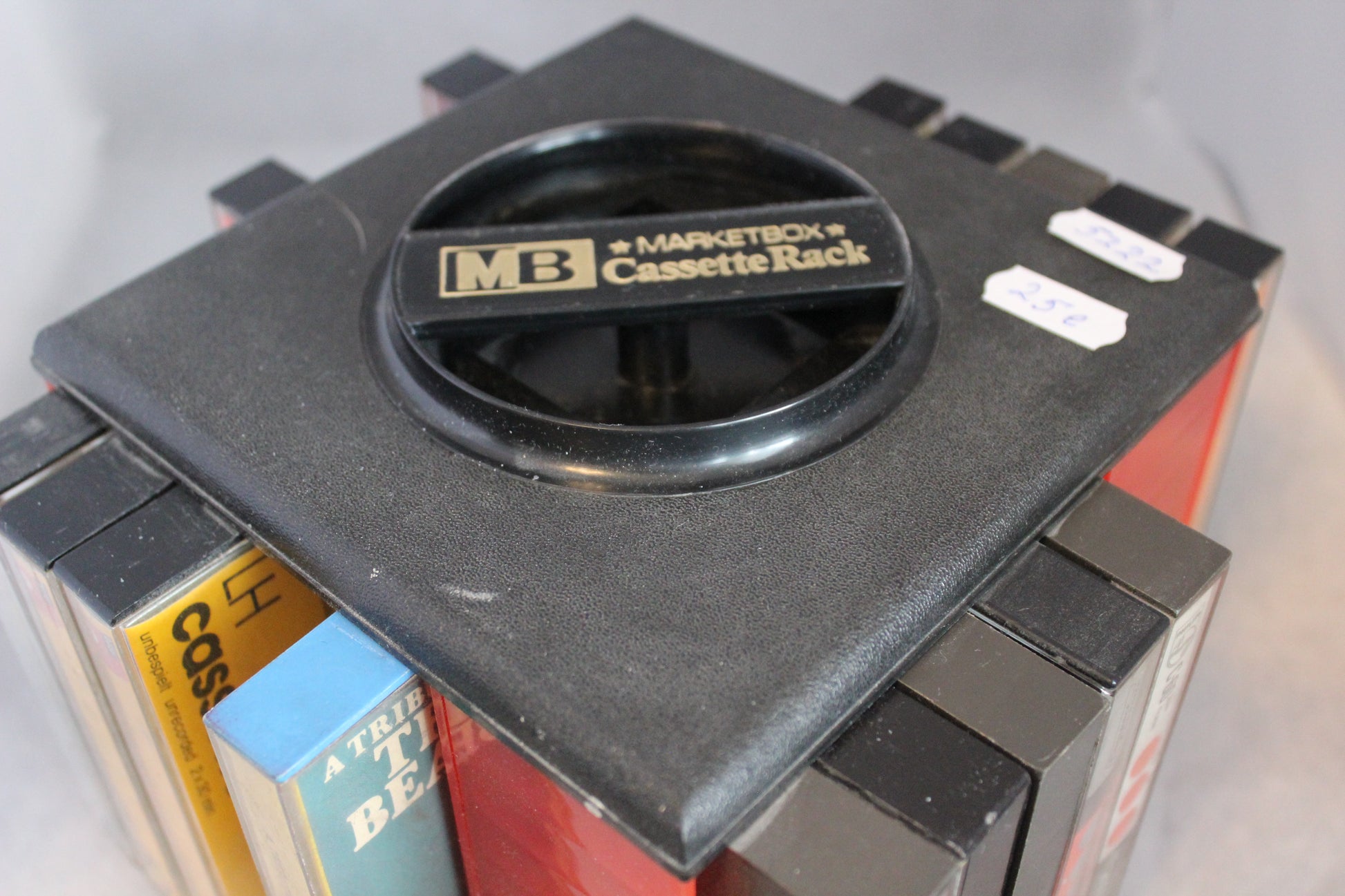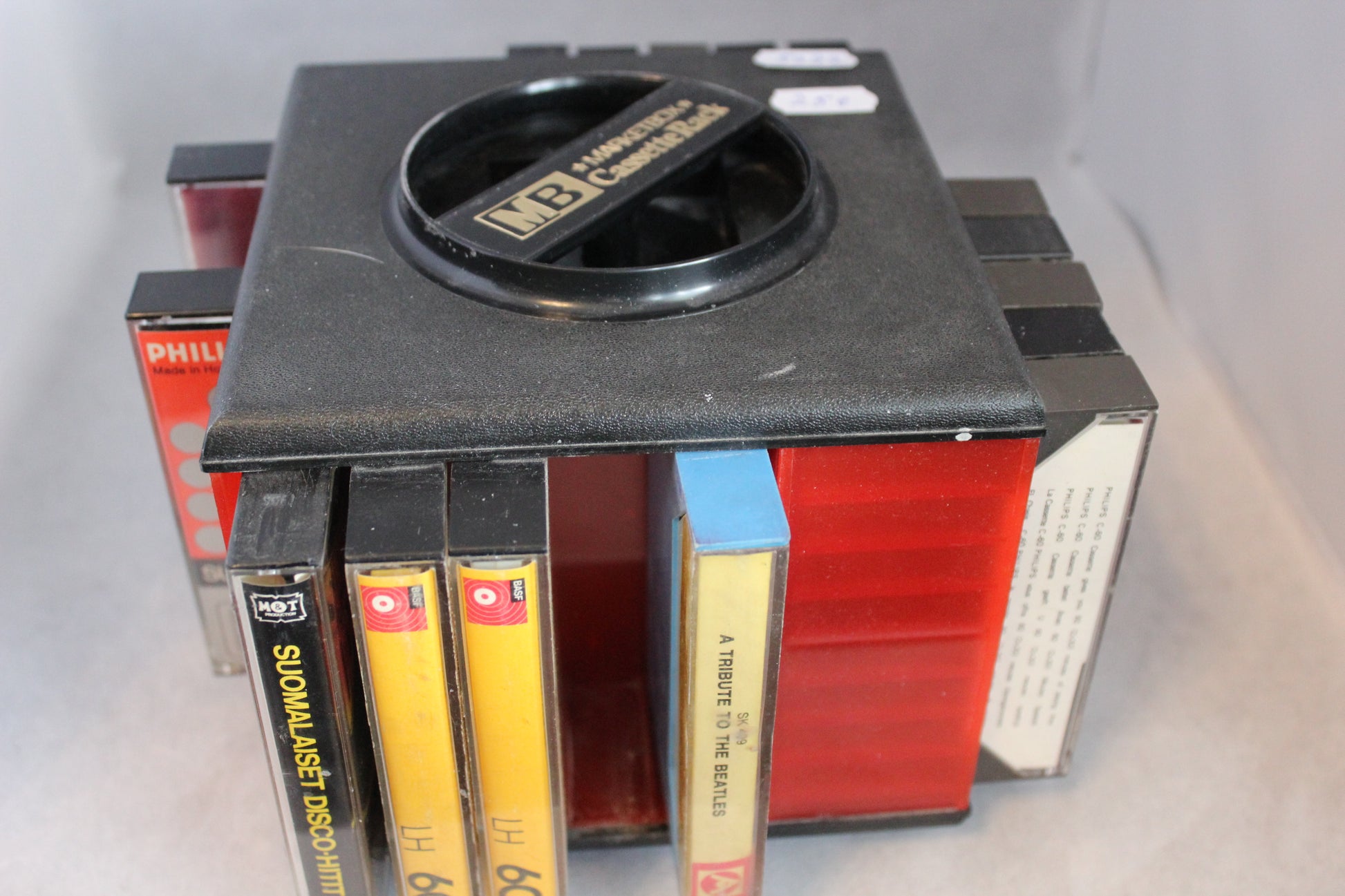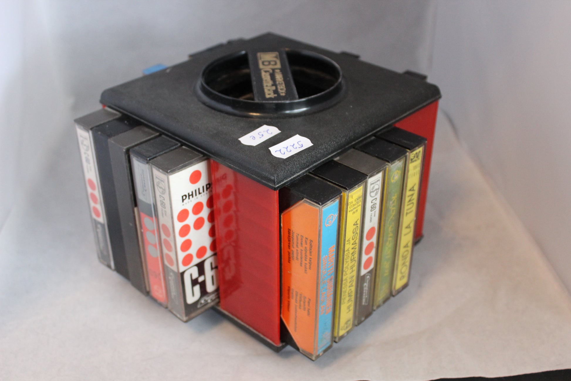 Pyörivä kasettiteline. Mahtuu 20 kasettia koteloineen.