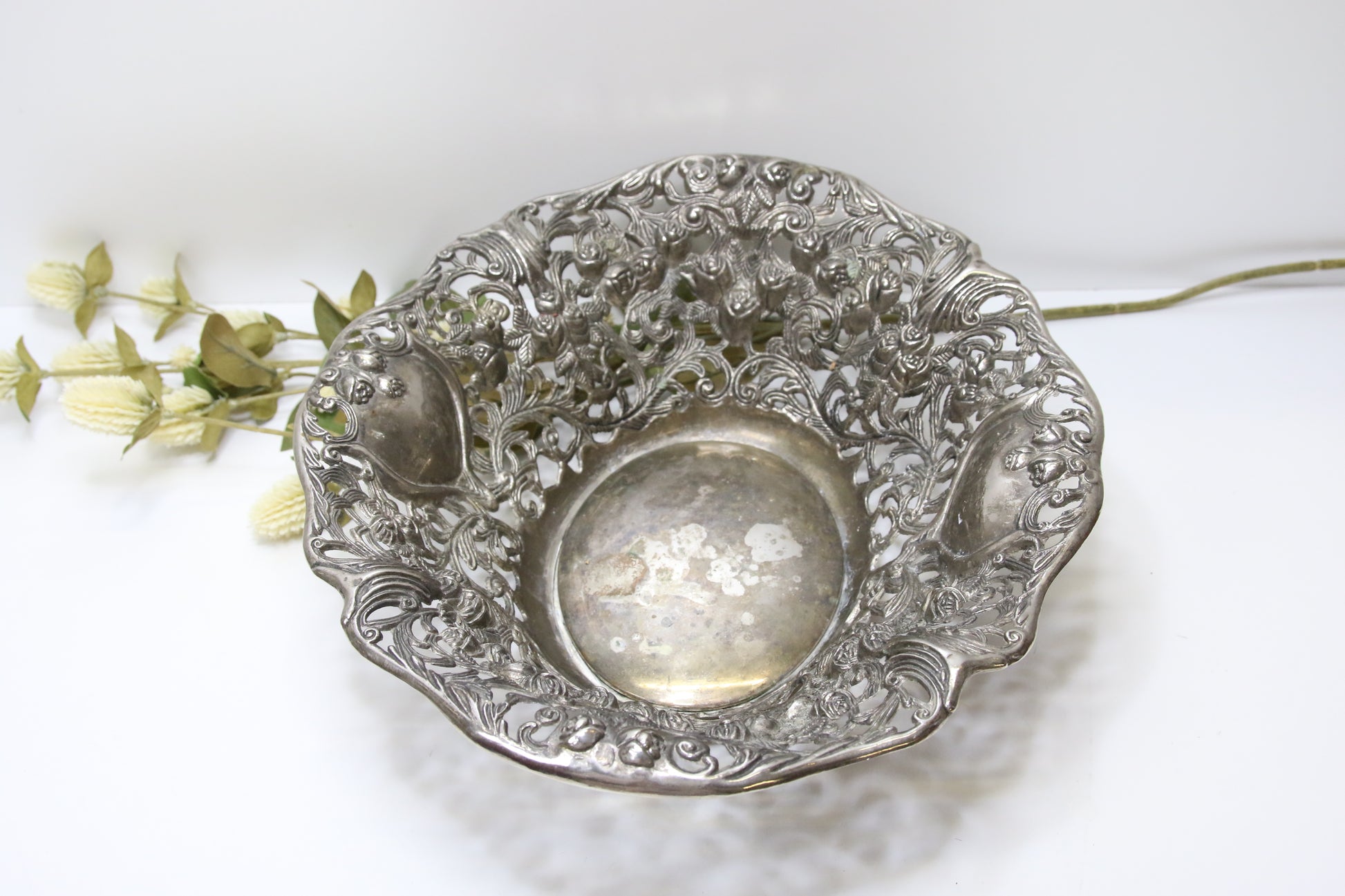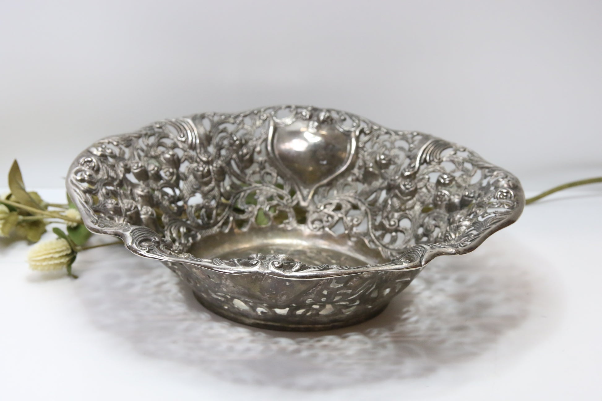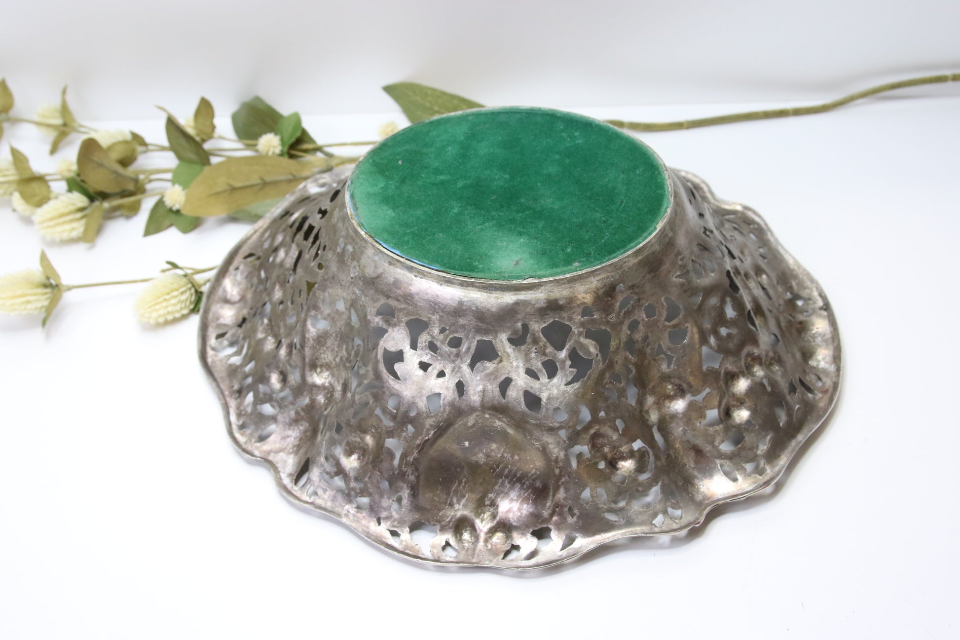 Lävistettyä koristelua, jossa on kukkia ja lehtiä.